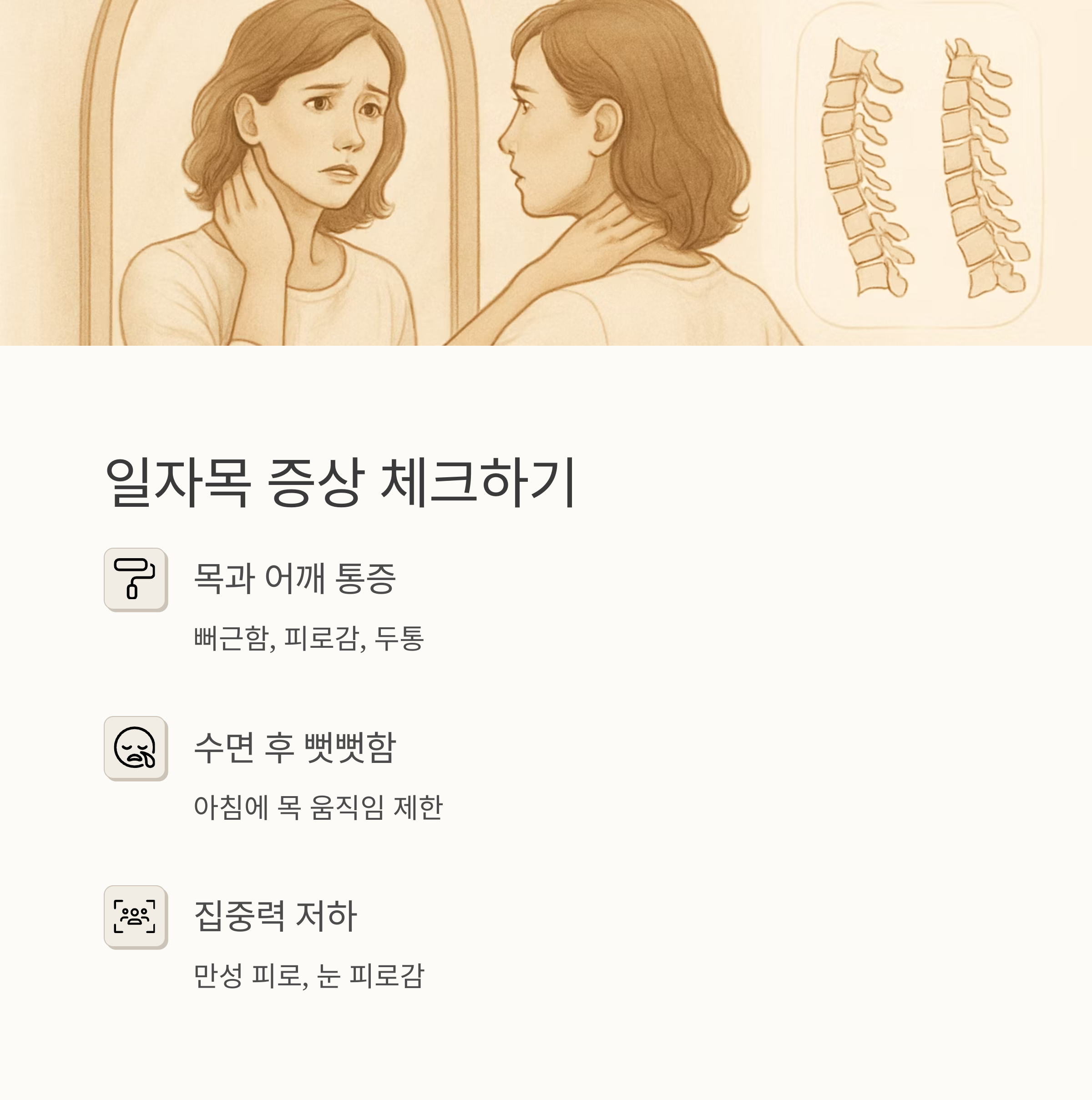 일자목은 어느 날 갑자기 나타나는 게 아니라, 평소 자세가 나쁘고 목에 무리가 가면서 서서히 진행돼요. 초기에는 목이나 어깨가 뻐근하거나 피로감을 느끼는 정도일 수 있지만, 점점 심해지면 두통, 손 저림, 심지어는 팔 저림까지 나타날 수 있어요.