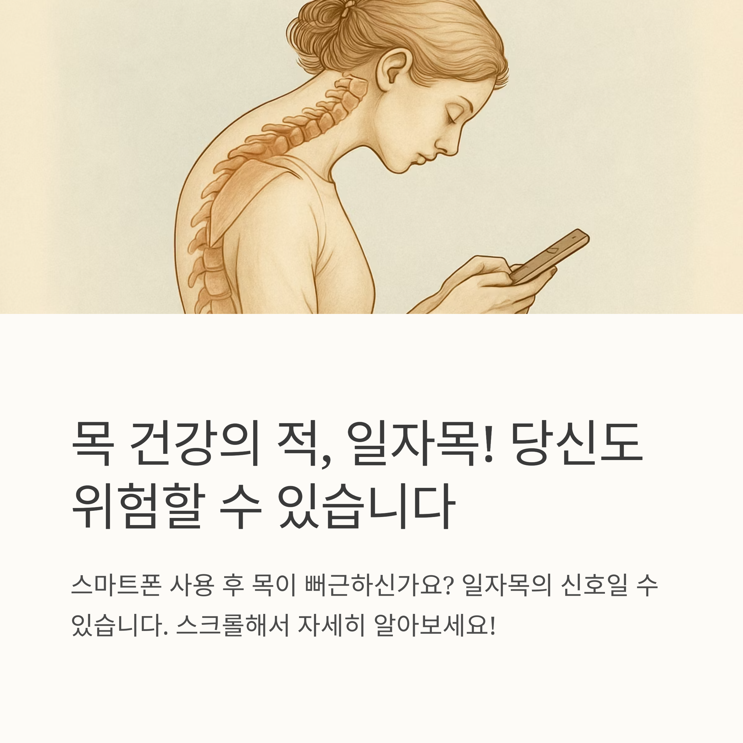 안녕하세요 여러분! 오늘은 우리 몸의 건강을 위협하는 일자목에 대해 속 시원하게 알아보는 시간을 갖도록 하겠습니다. 일자목, 혹시 들어보셨나요? 아마 많은 분들이 스마트폰이나 컴퓨터를 장시간 사용하면서 목이 뻐근하고 힘든 경험을 해보셨을 텐데요, 바로 이런 증상들이 일자목의 신호일 수 있습니다.