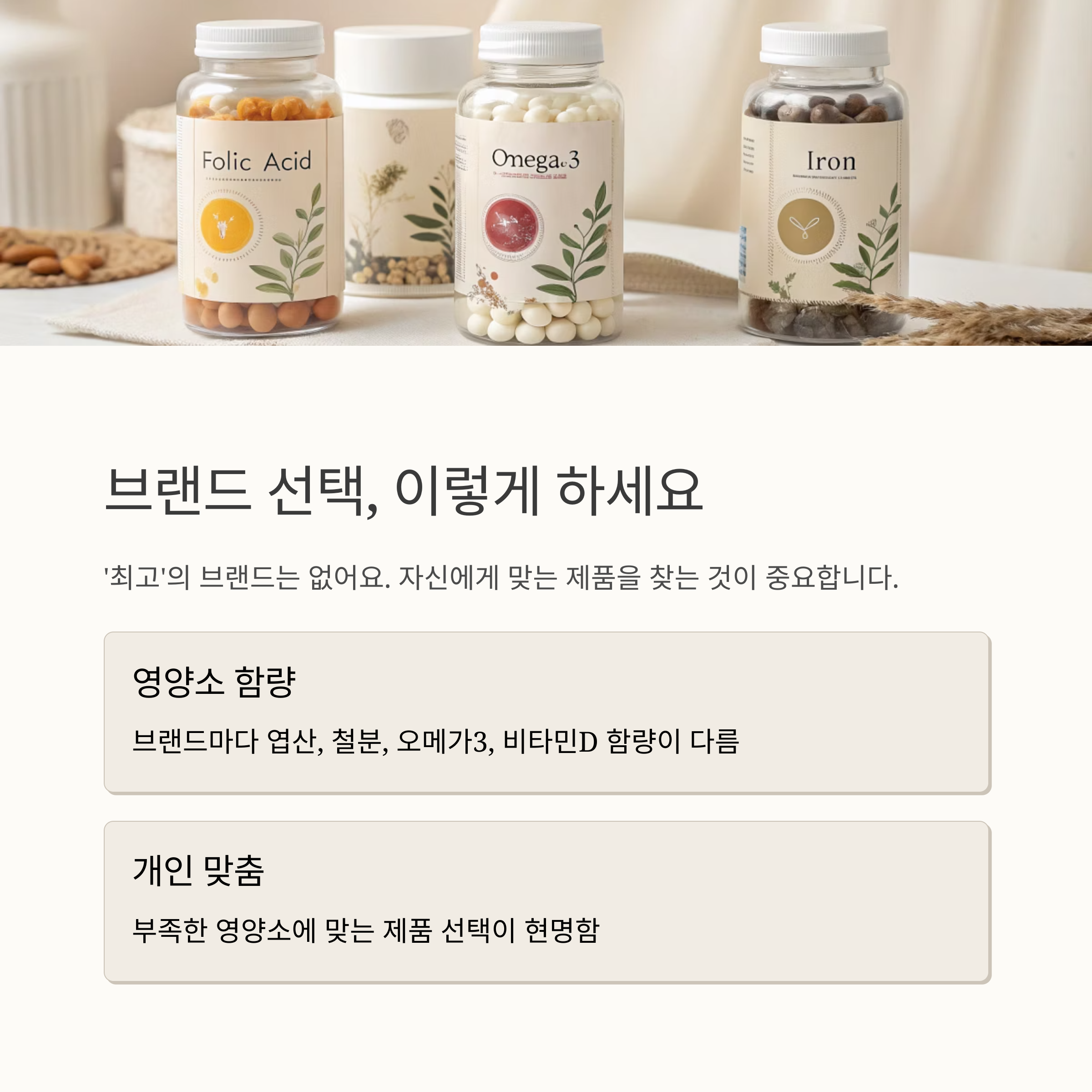 각 브랜드마다 엽산, 철분, 오메가3, 비타민D 함량이 다르고, 추가 성분도 다르거든요. 자신이 부족한 영양소가 무엇인지 확인하고, 그에 맞는 제품을 선택하는 게 현명한 방법이랍니다. 여러 브랜드의 제품들을 비교해보고, 자신에게 맞는 제품을 찾아보세요.