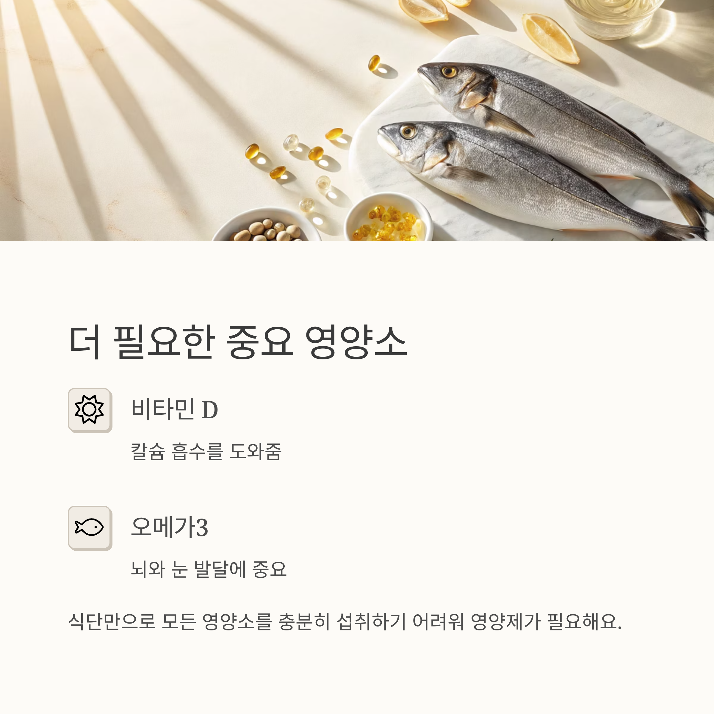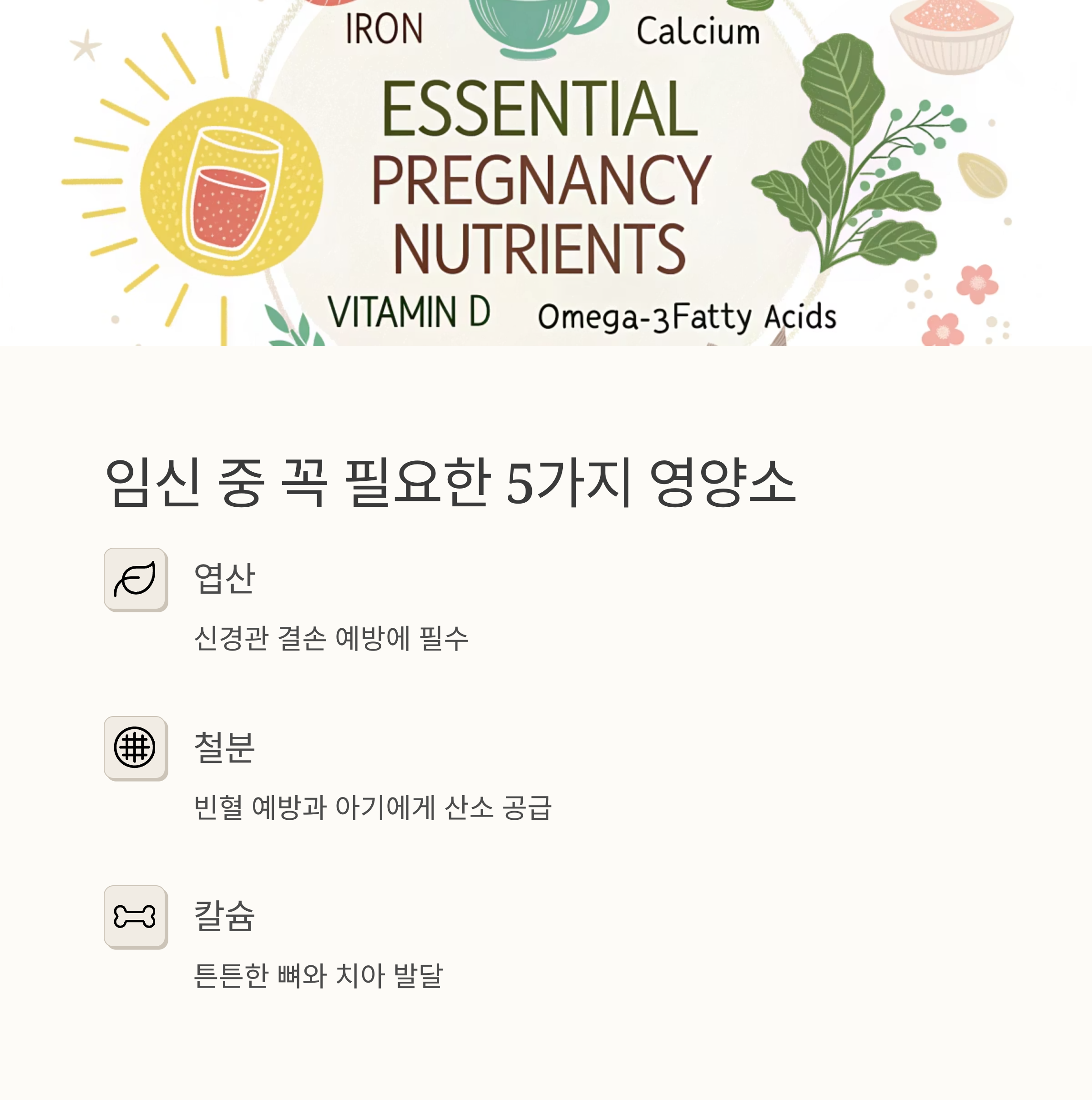 임신, 정말 축복이죠! 하지만 몸이 급격히 변하는 만큼, 엄마와 아기 모두에게 필요한 영양소도 많아져요. 엽산은 신경관 결손 예방에 필수고요, 철분은 빈혈 예방과 아기에게 산소를 공급하는 역할을 해요.칼슘은 튼튼한 뼈와 치아를 위해 꼭 필요하고, 비타민 D는 칼슘 흡수를 돕죠.