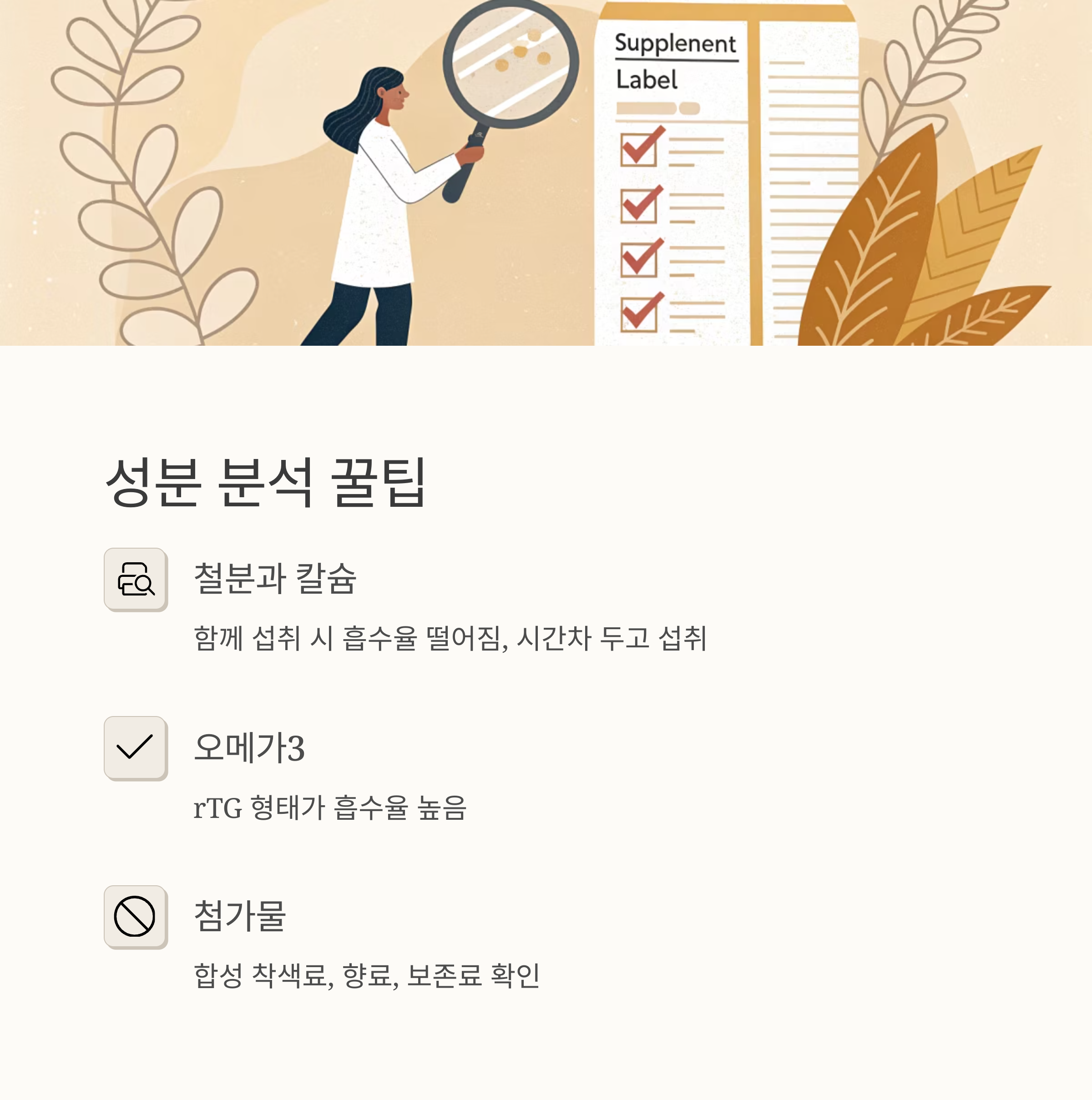 영양제를 고를 때는 ‘임산부용’이라고만 적혀 있다고 무작정 선택하면 안 돼요. 성분표를 꼼꼼하게 확인해야 해요! 특히 철분과 칼슘은 함께 섭취하면 흡수율이 떨어지니 시간차를 두고 먹거나, 따로 섭취하는 게 좋아요.