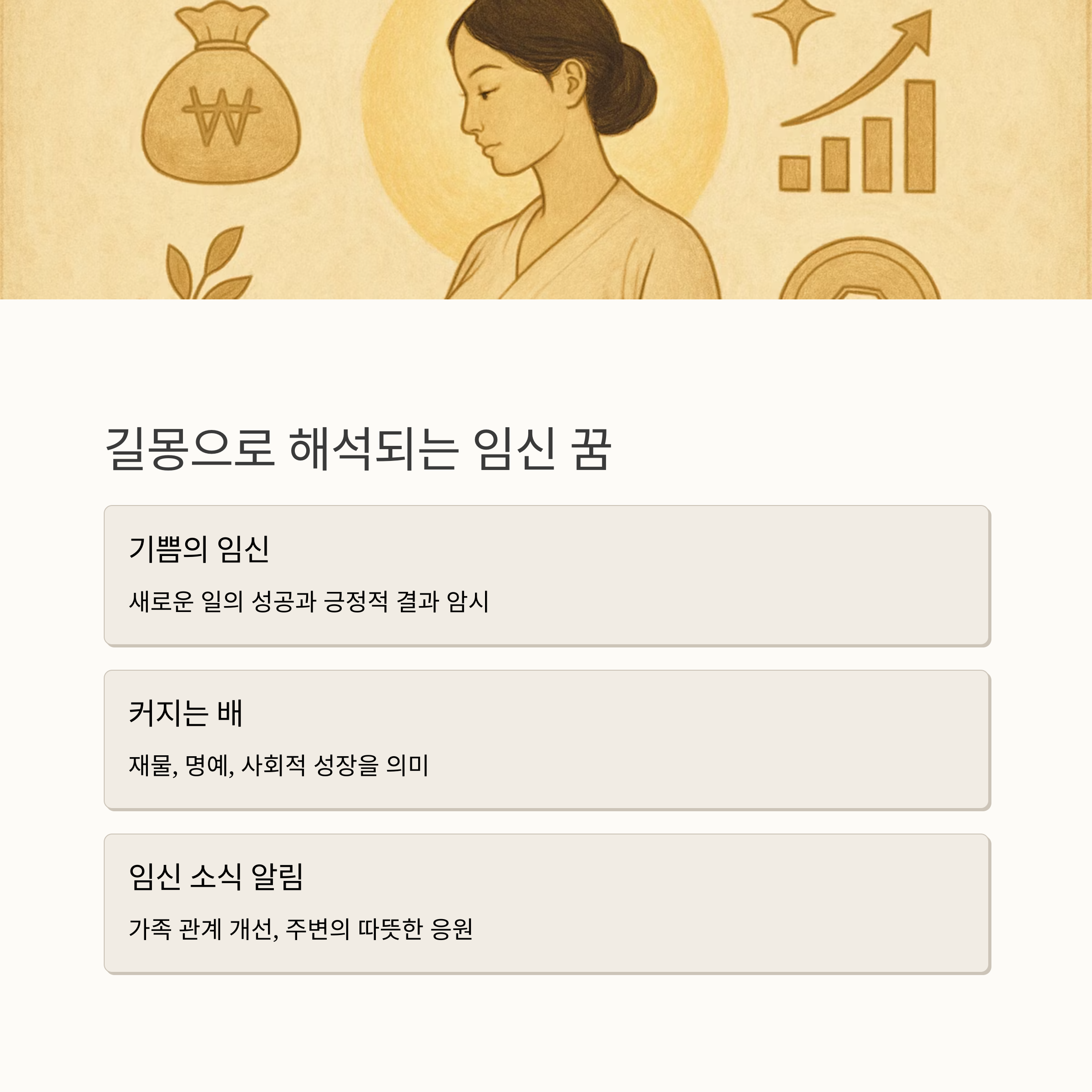 임신하는 꿈이 항상 나쁜 징조만을 의미하는 건 아니에요. 꿈에서 제가 임신을 하고 기뻐하는 모습을 보았다면? 그건 새로운 일의 성공이나 긍정적인 결과를 상징할 수 있어요. 배가 점점 커지는 꿈은 재물과 명예, 사회적 성장을 의미할 수도 있구요. 가족에게 임신 사실을 알리는 꿈은 가족 관계 개선이나 주변의 따뜻한 응원을 기대해볼 수도 있고요.
