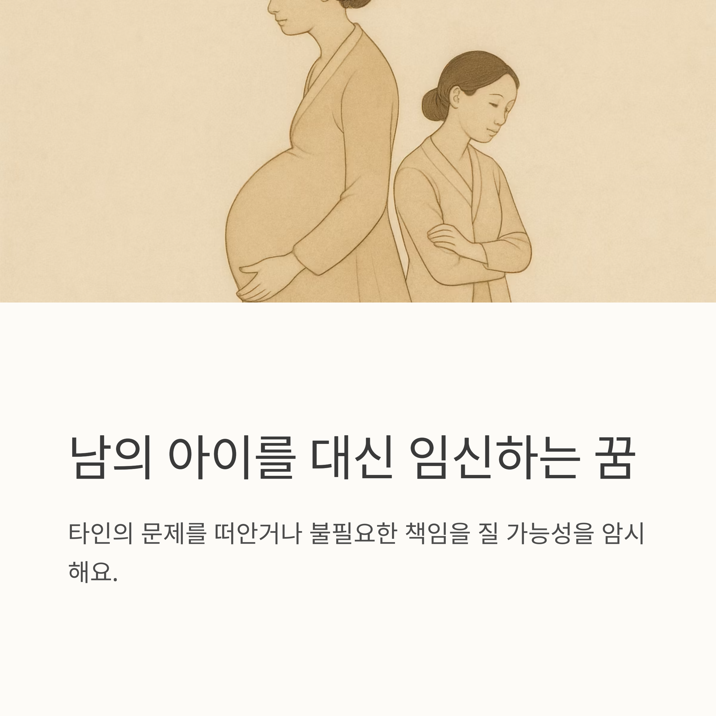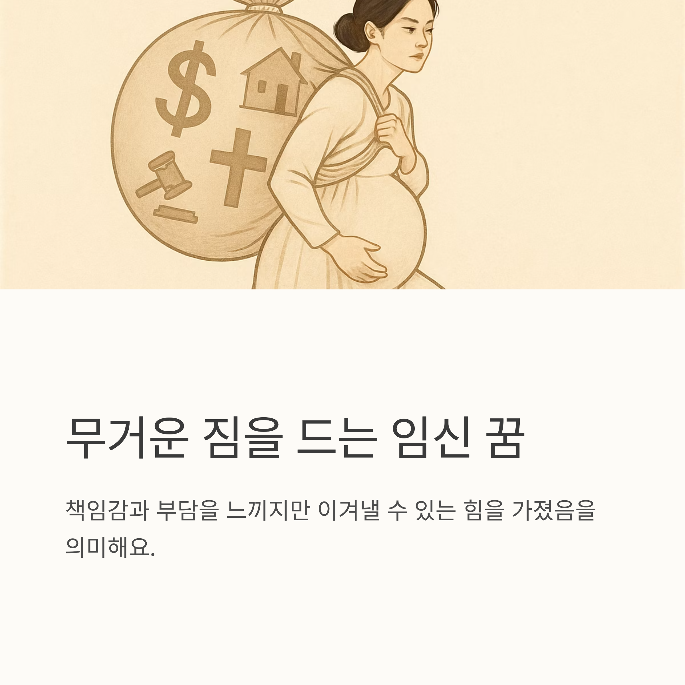 하지만 모든 임신 꿈이 좋은 의미만을 담고 있는 것은 아니에요. 임신 사실을 숨기려고 애쓰는 꿈은 감정적 불안이나 무언가를 숨기고 싶은 마음을 반영하는 흉몽일 수 있어요. 혹시 임신 후 울거나 괴로워하는 꿈을 꾸셨다면, 감당하기 힘든 책임이나 예상치 못한 문제를 암시하는 꿈일 수 있으니 주의가 필요합니다. 원치 않는 임신은 원치 않는 상황이나 관계에 놓일 가능성을 의미하고, 임신 중 몸이 아픈 꿈은 체력 저하나 정신적 피로를 경고하는 신호일 수 있어요.