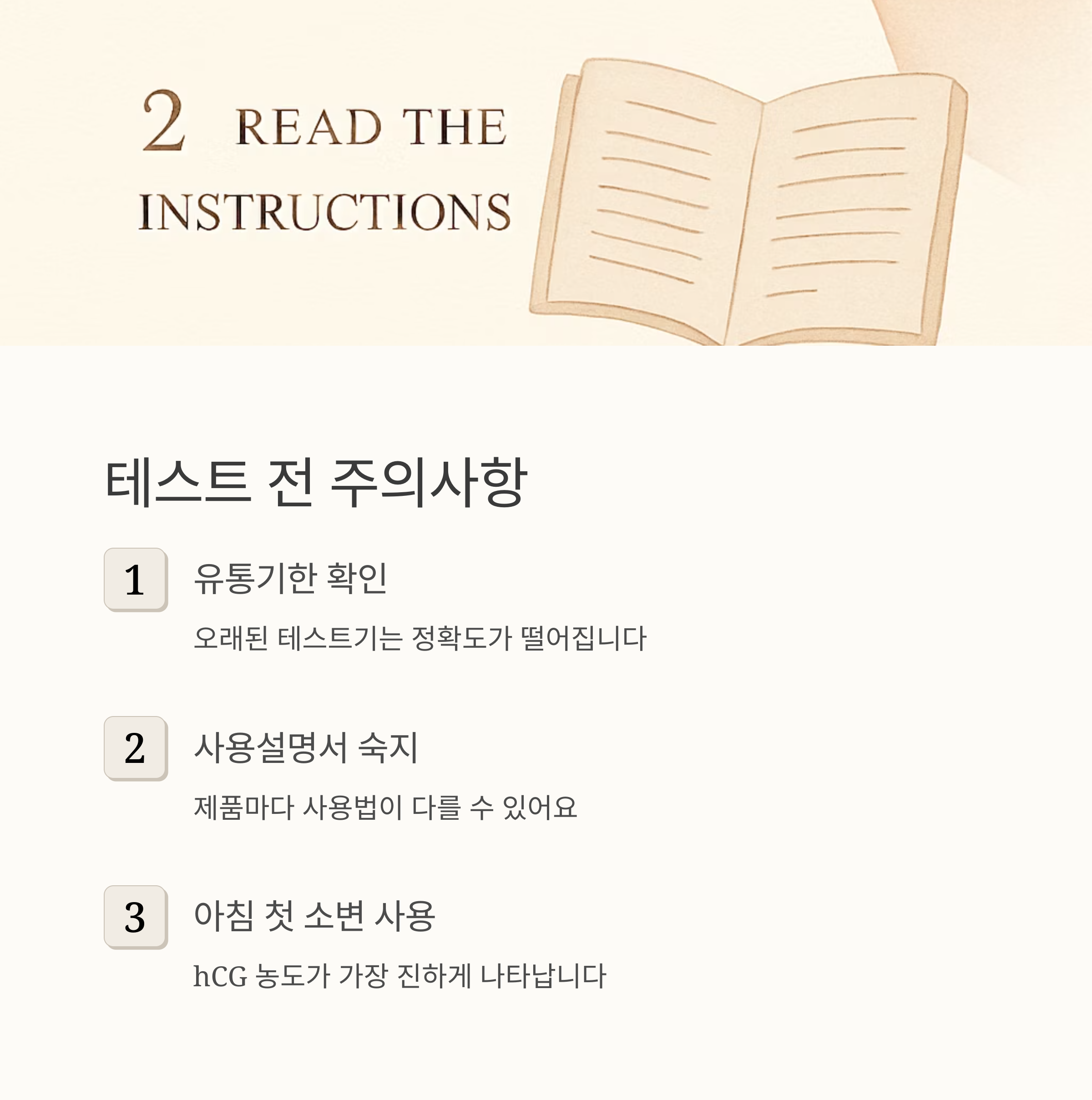 테스트기를 사용하기 전에 몇 가지 주의사항을 확인하는 것이 좋아요. 먼저, 테스트기의 유통기한을 확인하고, 사용 설명서에 나와 있는 사용 방법을 정확히 따라야 합니다. 그리고 아침 첫 소변을 사용하는 것이 좋은데, 소변이 너무 묽어도 정확도가 떨어질 수 있으니 너무 오래 참지 않도록 주의해야 합니다.
