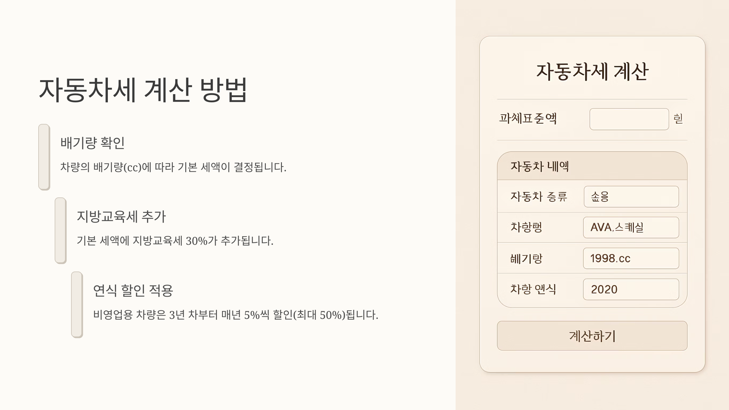 자동차세 계산은 생각보다 간단해요. 가장 중요한 건 차량의 배기량입니다. 배기량에 따라 기본 세액이 정해지고, 여기에 지방교육세 30%가 추가됩니다. 예를 들어 2000cc 차량이라면, cc당 세액에 2000을 곱하고, 거기에 30%를 더하면 되죠.