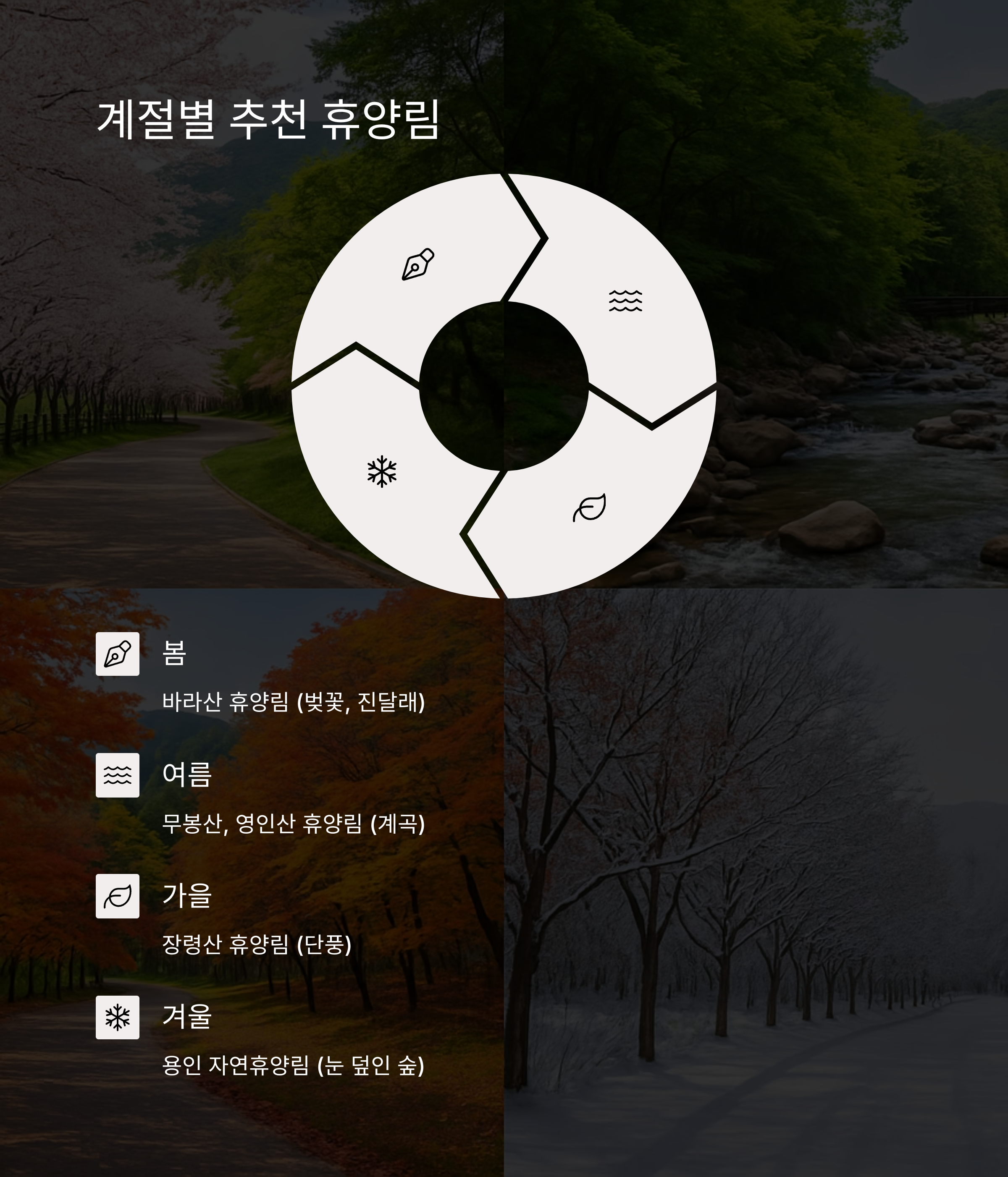 계절별로 추천하는 휴양림도 있는데요, 봄에는 벚꽃과 진달래가 아름다운 바라산 휴양림, 여름에는 시원한 계곡이 있는 무봉산이나 영인산 휴양림, 가을에는 단풍이 아름다운 장령산 휴양림, 겨울에는 눈 덮인 숲을 즐길 수 있는 용인 자연휴양림 등이 있습니다.