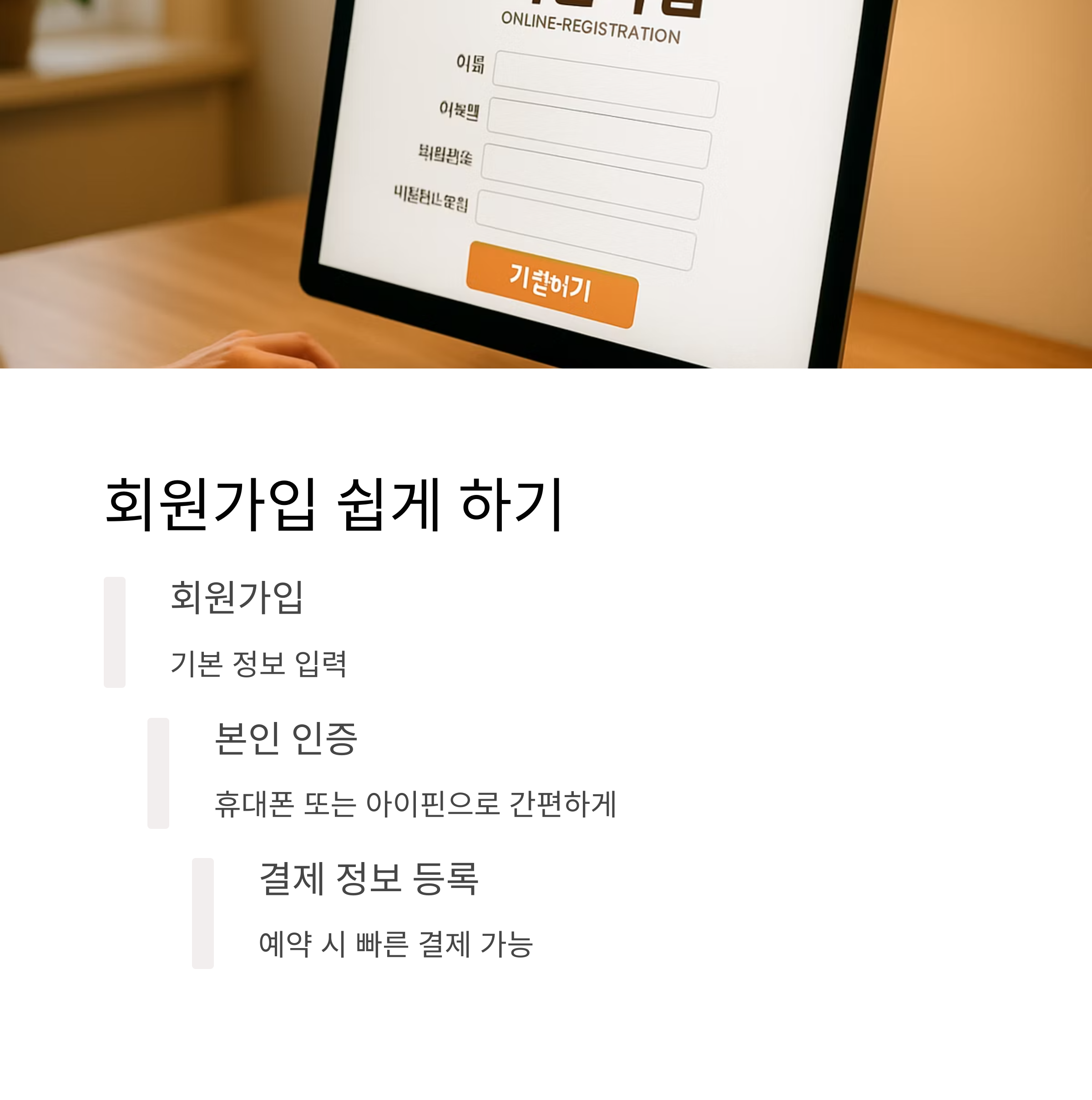 게다가 실시간 예약 현황까지 확인 가능하니, 마음이 더욱 편안하죠. 처음 이용하시는 분들도 걱정하지 마세요. 사이트에 친절한 설명들이 잘 나와있어서 어렵지 않게 이용하실 수 있을 거예요. 회원가입을 하고 나면 본인 인증을 거쳐야 하는데요, 휴대폰이나 아이핀 등 편한 방법으로 인증하시면 됩니다. 기본적인 개인정보와 결제 정보를 입력하시면 예약 준비는 끝! 어렵지 않죠?