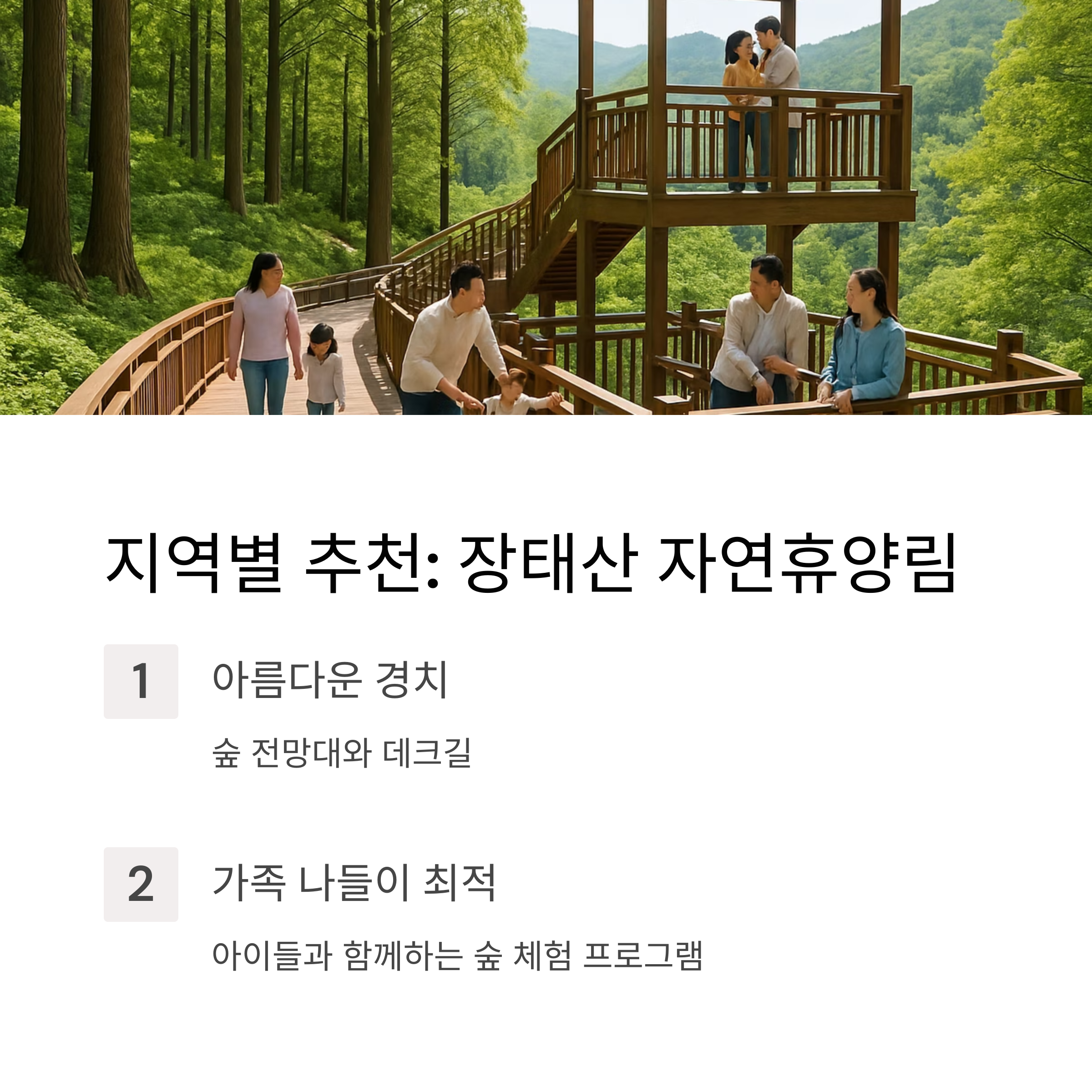 자, 이제 어떤 휴양림을 선택할지 고민이시죠? 제가 추천하는 몇 곳을 소개할게요. 먼저, 경치가 아름답기로 유명한 장태산 자연휴양림은 숲 전망대와 걷기 좋은 데크길이 있어서 가족 나들이에 딱 좋아요. 아이들과 함께 숲 체험 프로그램도 참여할 수 있답니다.
