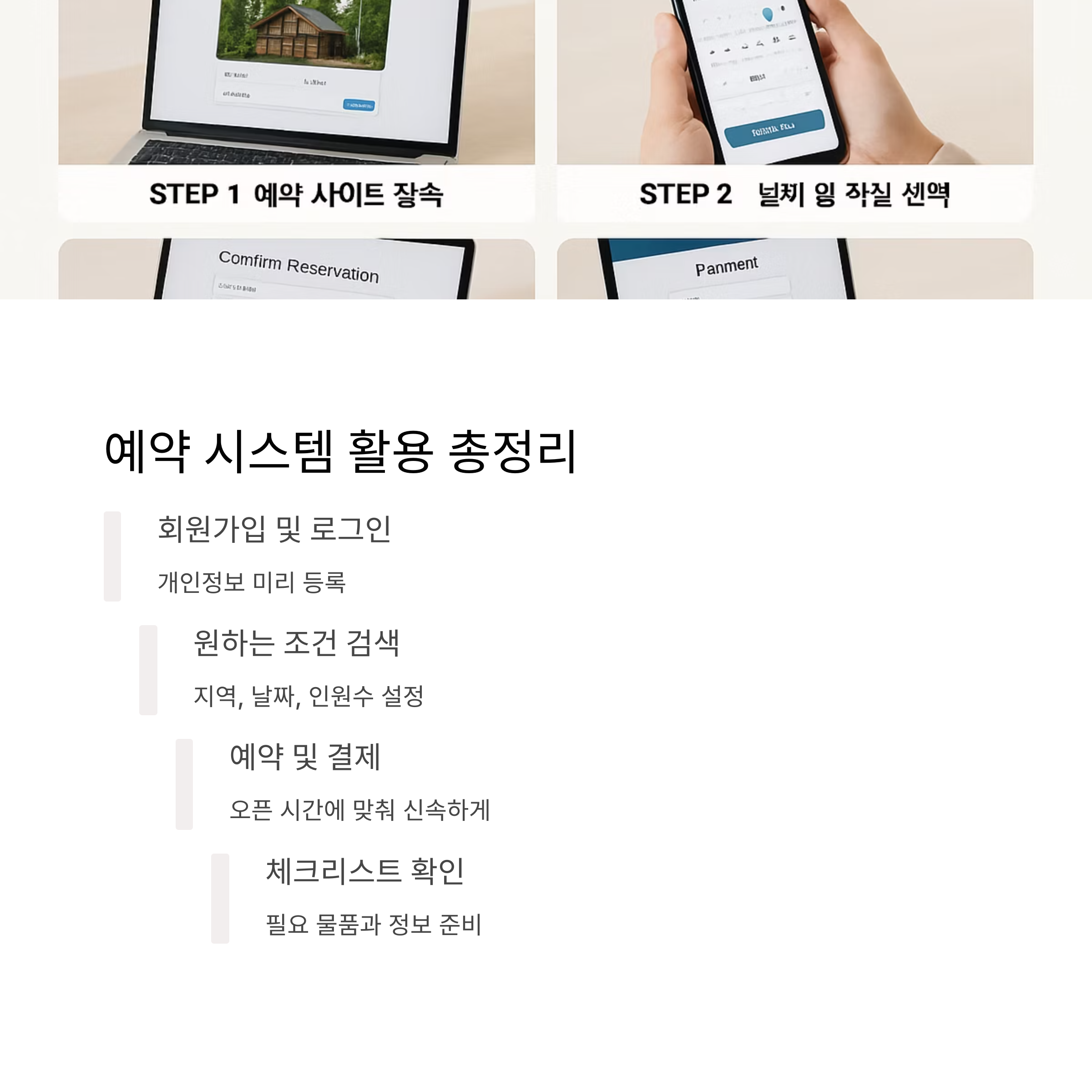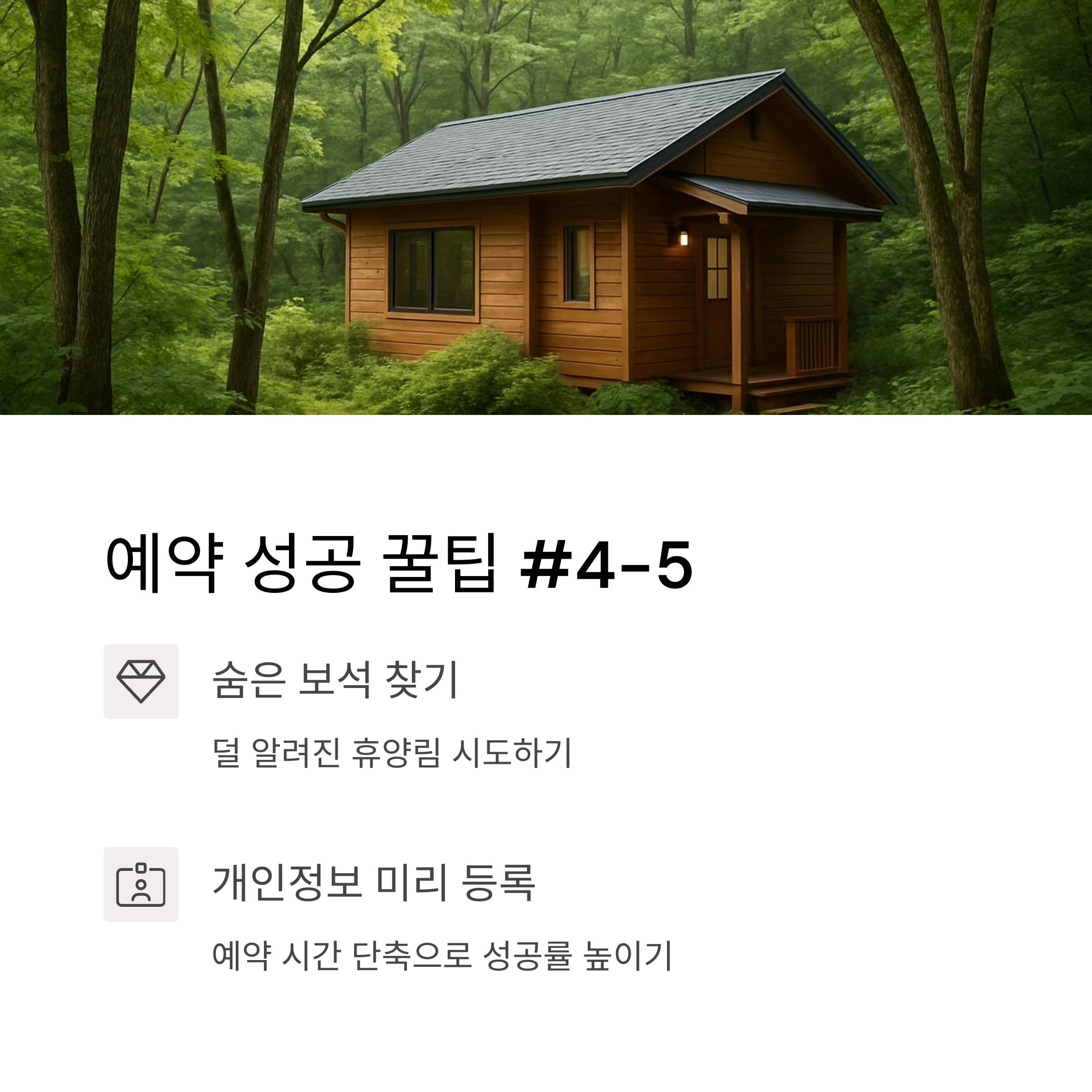 네 번째는 숨은 보석 같은 휴양림을 찾아보는 거예요. 너무 유명한 곳만 고집하지 말고, 덜 알려진 곳을 찾아보면 의외로 훌륭한 곳을 발견할 수 있답니다. 마지막 다섯 번째 팁은 바로 회원가입과 개인정보 미리 등록이에요.