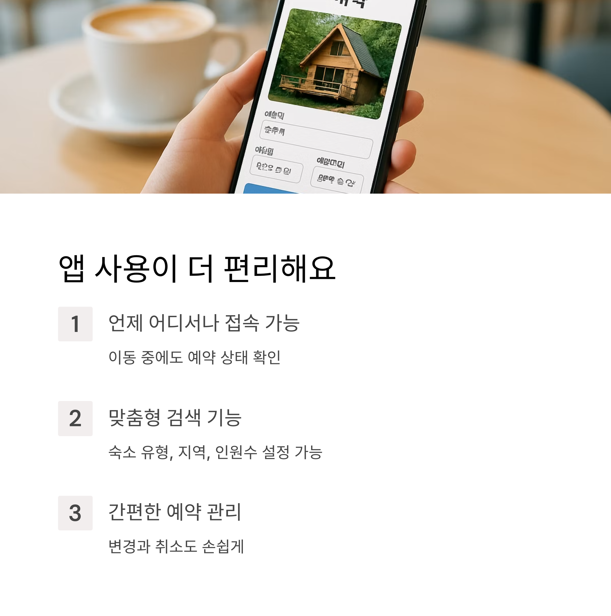 저는 개인적으로 앱이 더 편하더라고요. 언제 어디서든 예약 현황을 확인하고 예약 변경이나 취소까지 가능하니까요. 예약 가능한 날짜는 달력으로 깔끔하게 나와서 한눈에 알아보기 쉬워요. 숙소 유형, 지역, 인원수 등 원하는 조건을 설정해서 검색하면 더욱 효율적으로 원하는 곳을 찾을 수 있답니다.