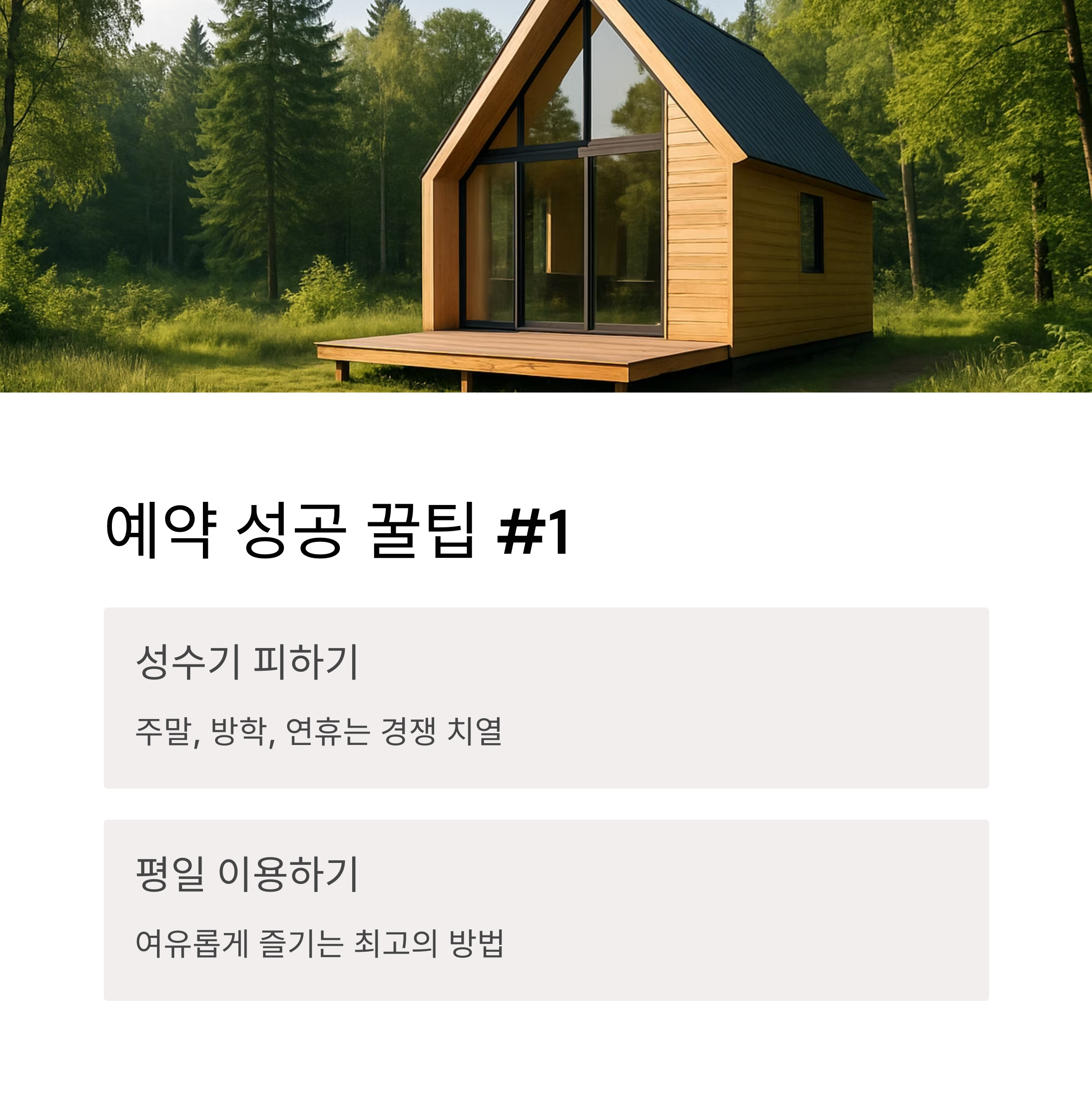 예약은 보통 매월 1일이나 마지막 주 월요일 오전 9시부터 다음 달 예약이 오픈합니다. 성수기 인기 휴양림은 추첨제를 운영하는 경우가 있으니, 시스템에서 응모하고 당첨되면 문자 안내를 받고 결제하면 됩니다. 예약이 마감된 객실에는 대기 등록을 할 수 있고, 취소 발생 시 순차적으로 배정됩니다.