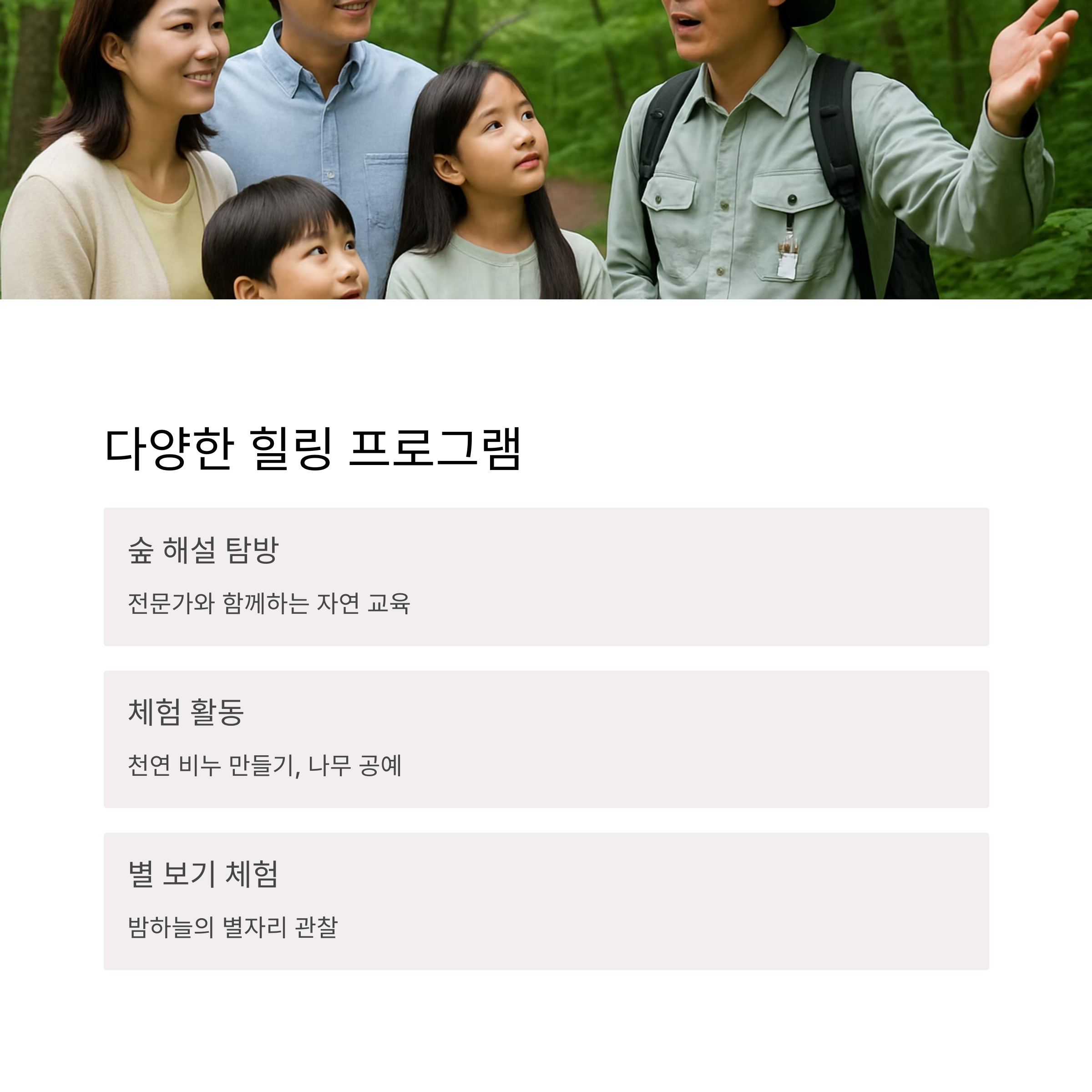 자연휴양림은 단순히 잠만 자는 곳이 아니랍니다! 다양한 힐링 프로그램들이 준비되어 있어요. 아이들과 함께 숲 해설 탐방에 참여해보거나, 천연 비누 만들기 체험을 해보는 것도 좋고요. 나무 공예나 별 보기 체험 등도 정말 멋진 경험이 될 거예요.