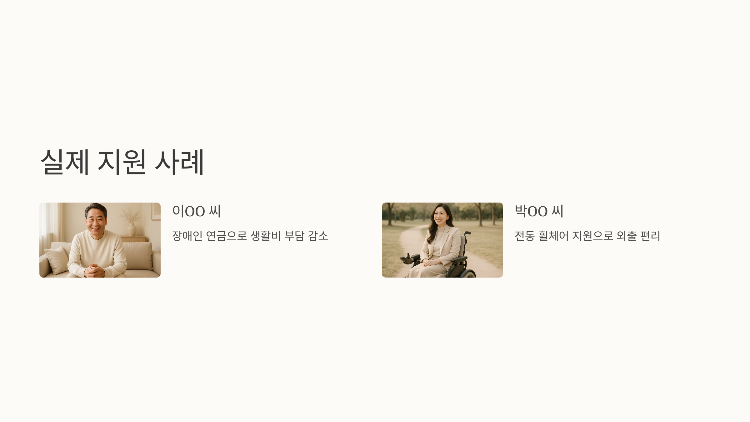 실제로 지원금을 받은 분들의 이야기를 들어볼까요? 이OO씨는 장애인 연금을 통해 생활비 부담을 줄일 수 있었다고 해요. 박OO씨는 보조기기 지원으로 전동 휠체어를 구입해 외출이 편리해졌다고 하네요.