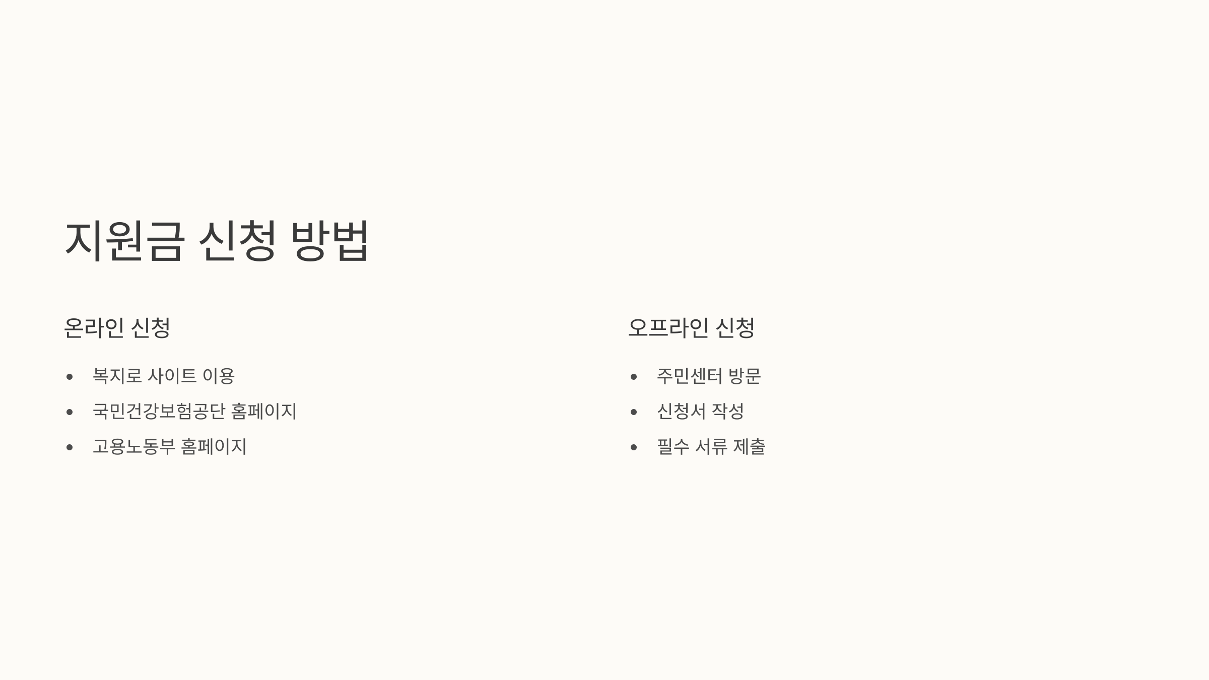 장애인 지원금 신청 방법은 온라인과 오프라인 두 가지가 있어요. 장애인 연금이나 수당은 복지로 사이트에서 편리하게 온라인으로 신청할 수 있어요. 보조기기 지원은 국민건강보험공단이나 주민센터에서 신청할 수 있고요.