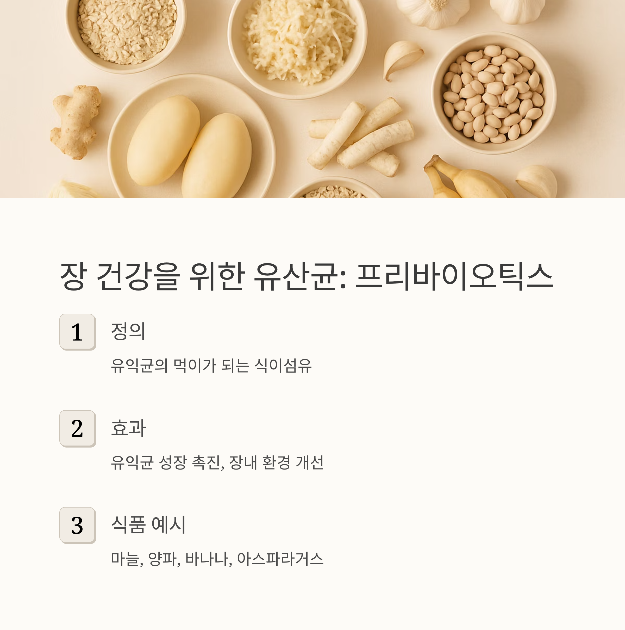 된장도 빼놓을 수 없죠. 된장 속 발효균들은 장 건강을 돕고 면역력까지 높여준답니다. 하지만 나트륨 함량이 높으니 적당히 드시는 게 중요해요. 달콤한 바나나는 프리바이오틱스 성분인 이눌린이 풍부해서 유익균의 먹이가 되어 장내 환경 개선에 도움을 준답니다.