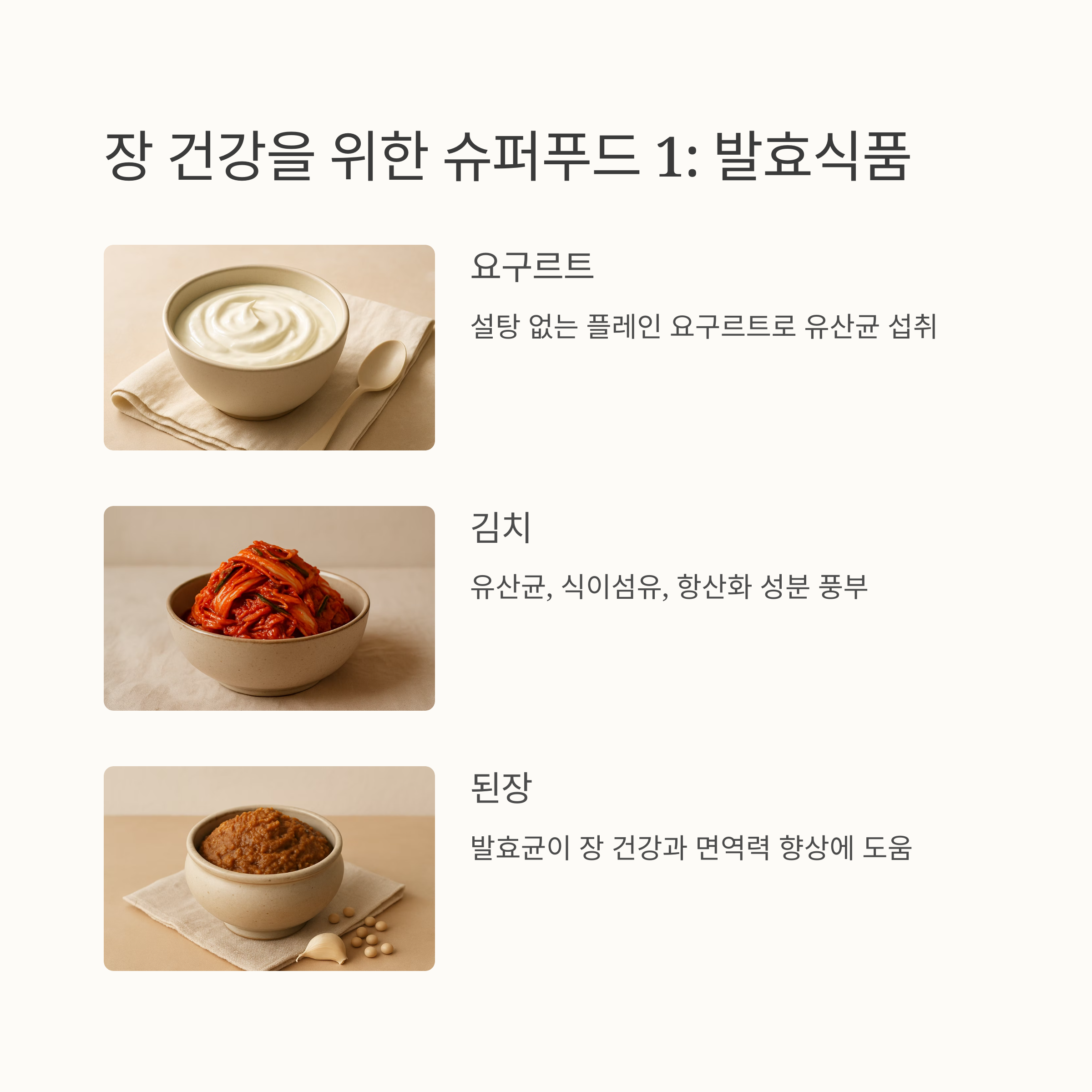 자, 이제 장 건강에 꼭 필요한 장에 좋은 음식들을 소개할게요. 비밀 레시피처럼, 몸에 좋은 음식들을 꼼꼼하게 골라봤답니다. 먼저, 요구르트는 유산균의 보고죠. 특히 설탕이 첨가되지 않은 플레인 요구르트가 장 건강에 더욱 좋답니다. 그리고 우리나라 대표 발효 음식인 김치! 유산균과 식이섬유, 그리고 항산화 성분까지 듬뿍 들어 있어 장내 유익균 증가에 효과적이에요.