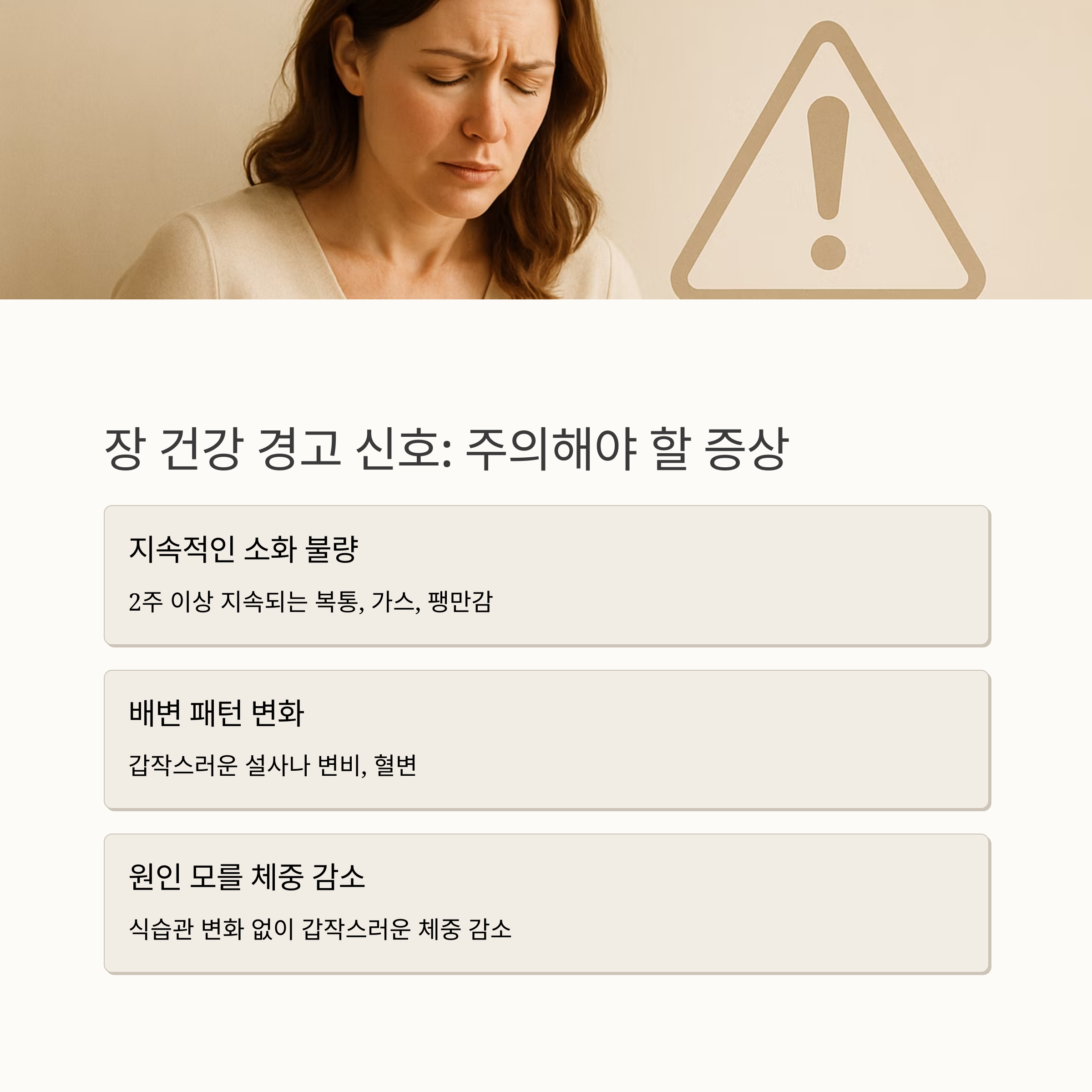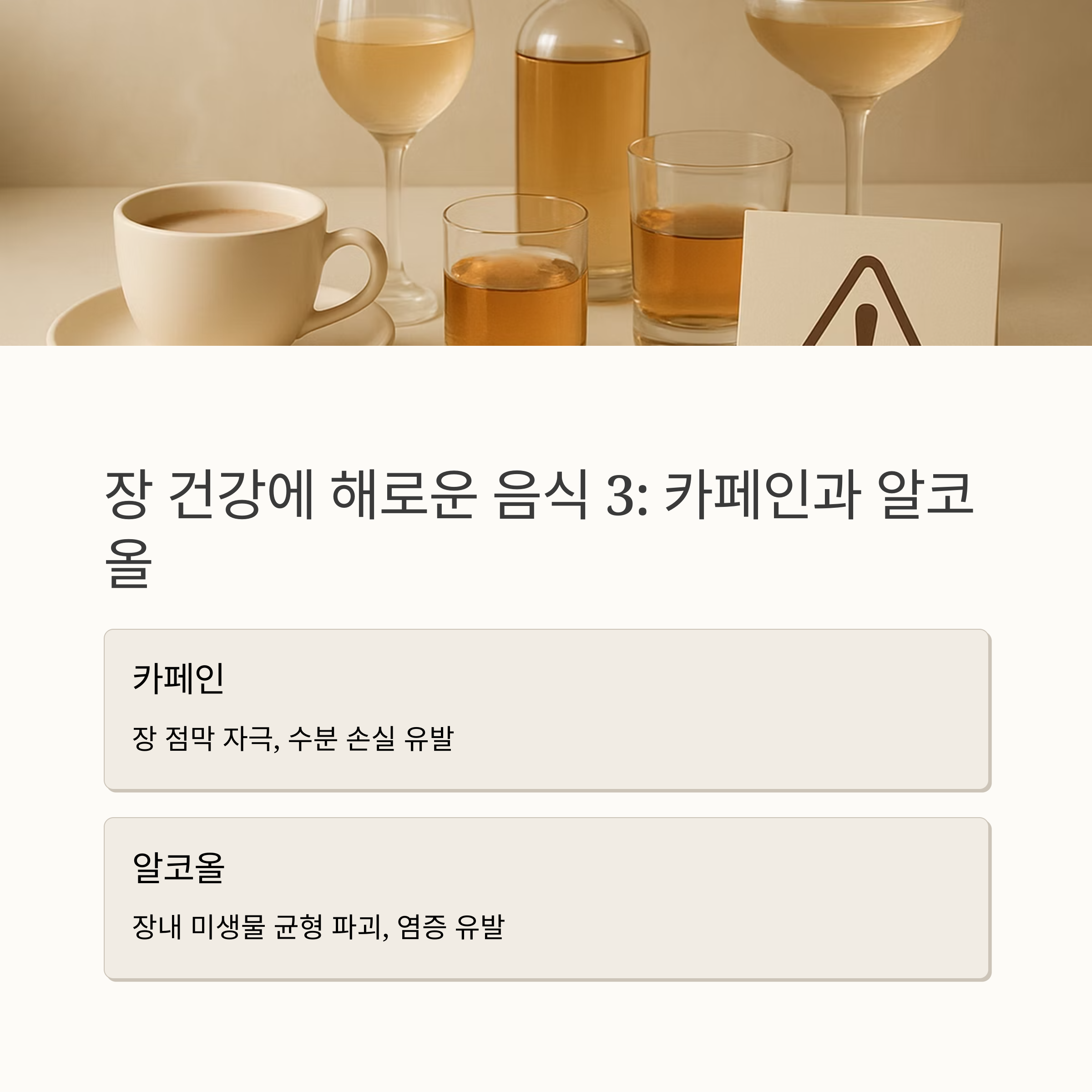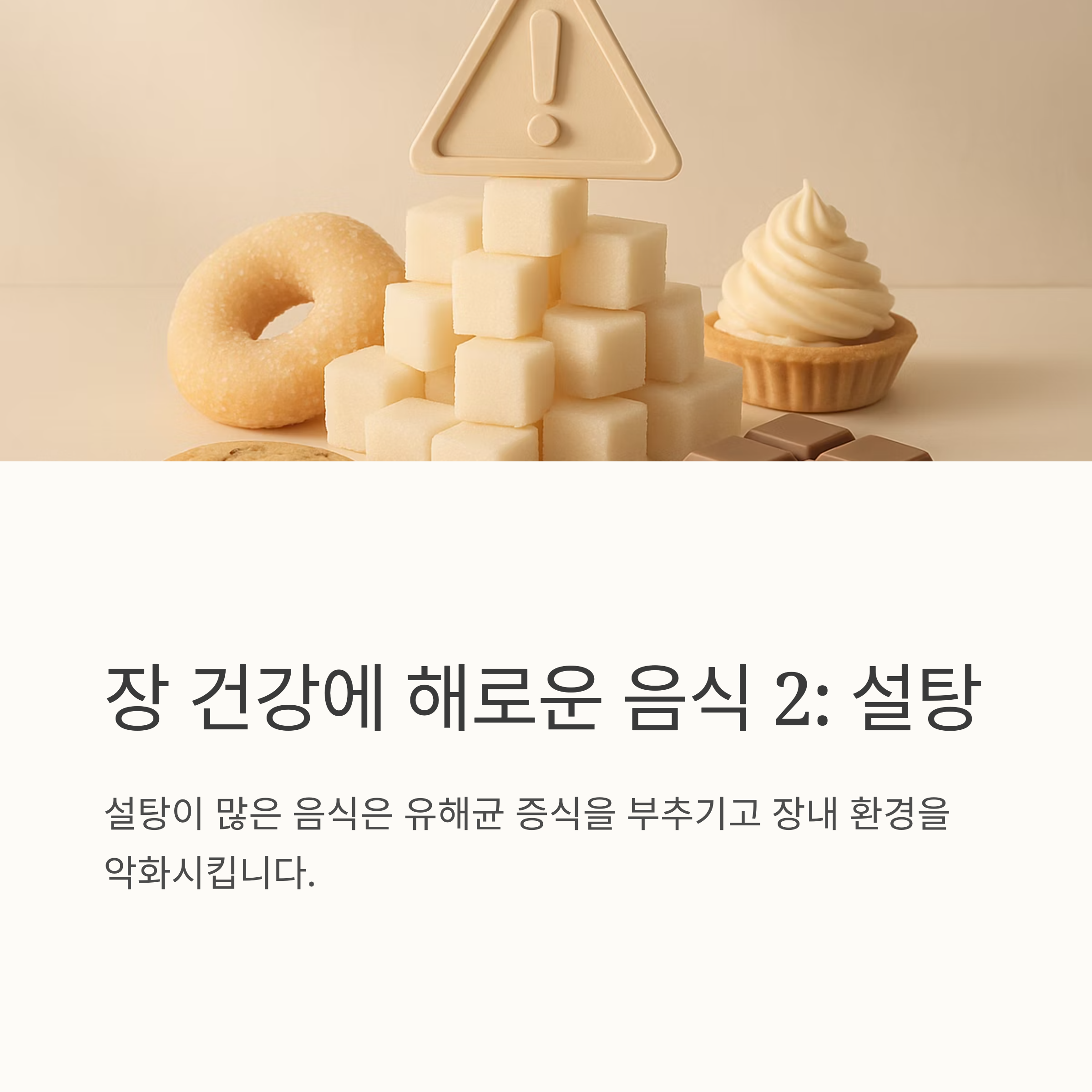 장 건강을 해치는 음식과 습관도 알아두어야겠죠? 과도한 육류 섭취는 장내 부패균을 증가시키고, 설탕이 많은 음식은 유해균 증식을 부추긴답니다. 과도한 카페인이나 알코올 섭취는 장 점막을 자극하고 수분 손실을 유발하며 장기간 항생제 복용은 장내 미생물 균형을 깨뜨릴 수 있어요. 그리고 스트레스는 장 건강에 가장 큰 적이라고 할 수 있죠. 스트레스는 장 신경계에 직접적인 영향을 주어 장 기능을 저하시킨답니다.