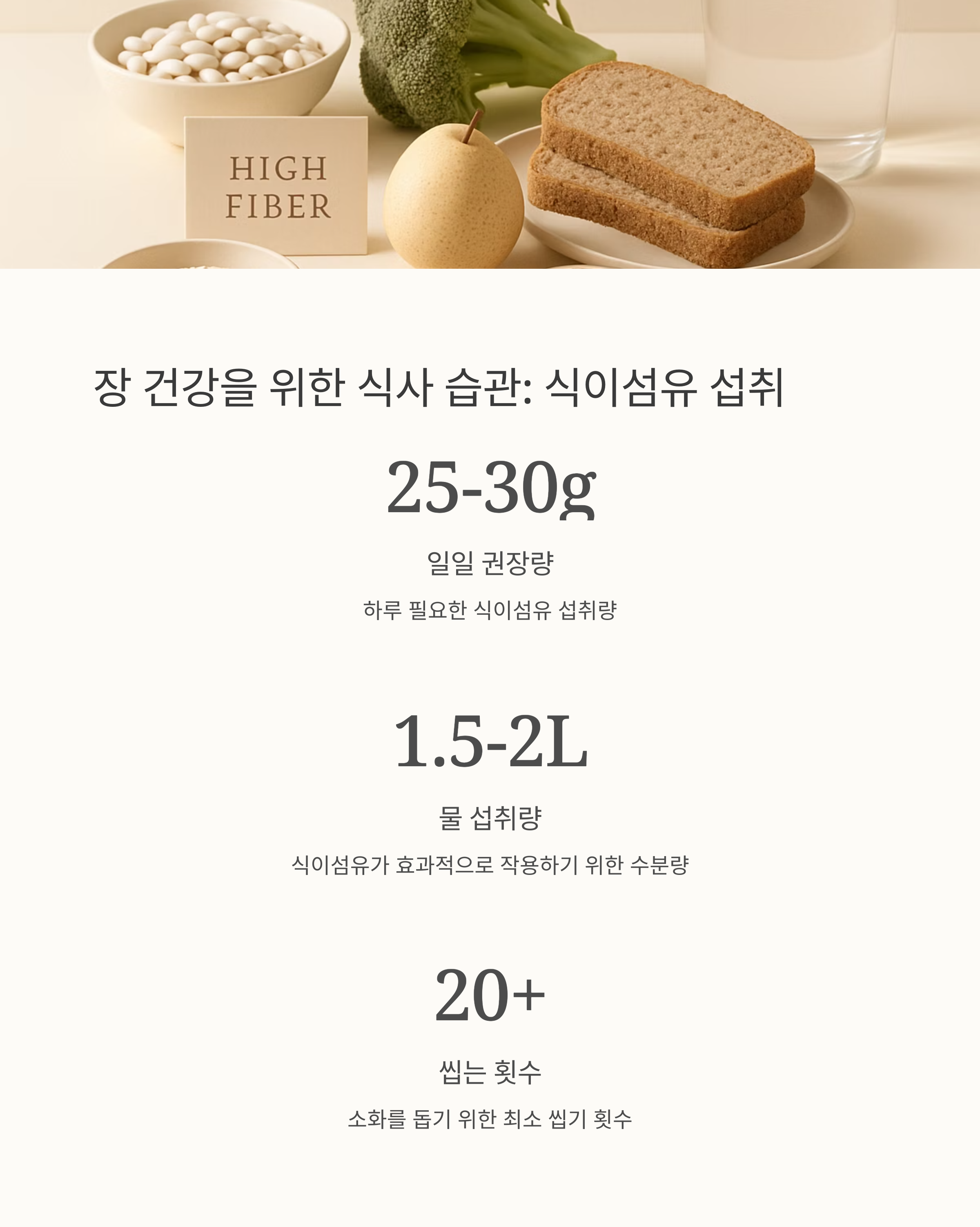 수분 섭취도 잊지 마세요! 식이섬유가 제대로 작용하려면 충분한 수분이 필요하답니다. 하루 1.5-2리터의 물을 마시는 것을 목표로 해보세요. 또한, 폭식이나 급하게 먹는 습관은 장에 큰 부담을 줄 수 있으니 천천히, 꼭꼭 씹어 먹는 습관을 들이도록 노력하세요. 소화가 잘 되도록 20번 이상 씹는 연습을 해보시는 건 어떠세요?