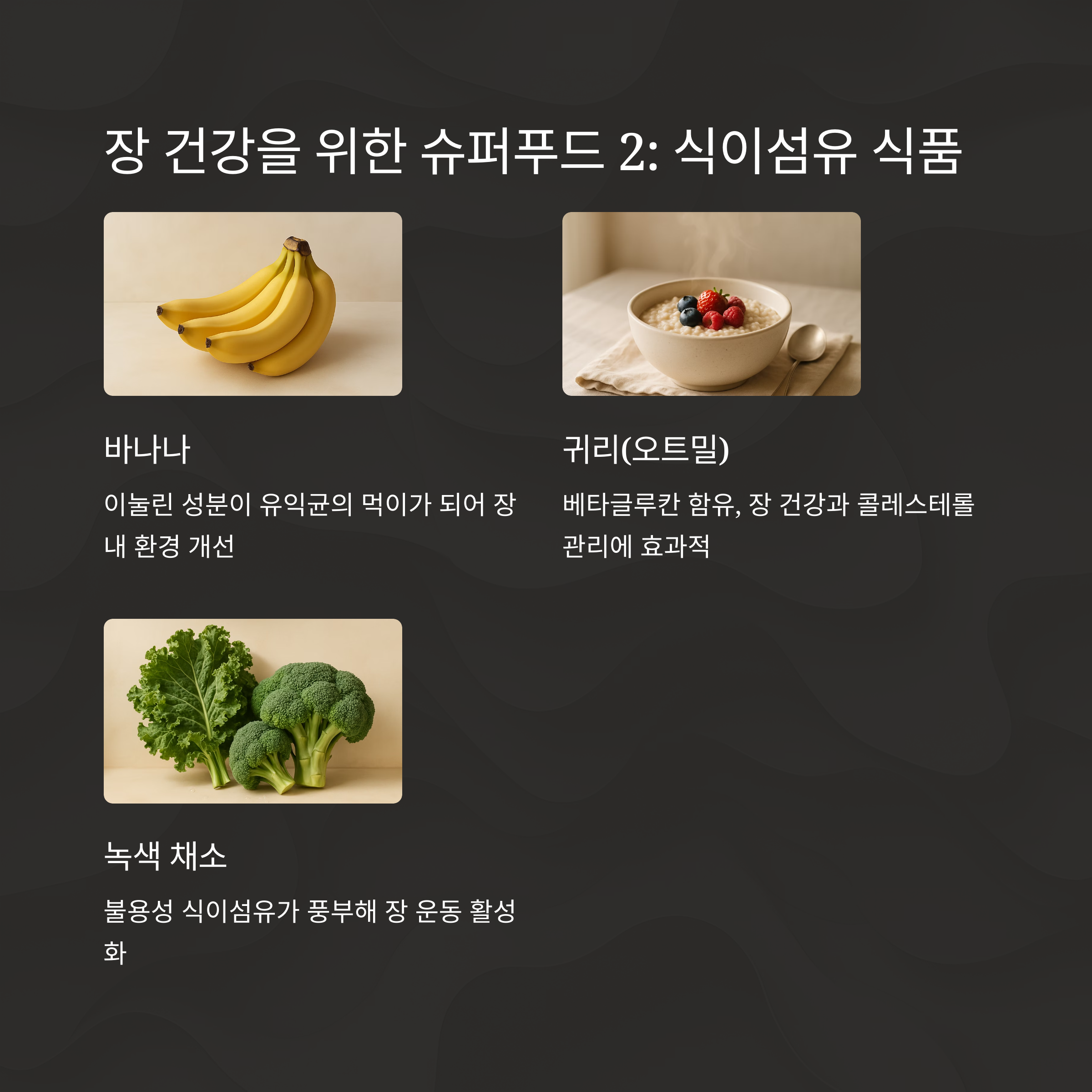 변비에도 효과적이라고 하니 꼭 챙겨 드세요! 그리고 식이섬유의 제왕, 귀리(오트밀)도 잊지 마세요. 베타글루칸이라는 수용성 식이섬유가 풍부해서 장 건강은 물론 콜레스테롤 수치까지 관리하는 데 도움이 된답니다.