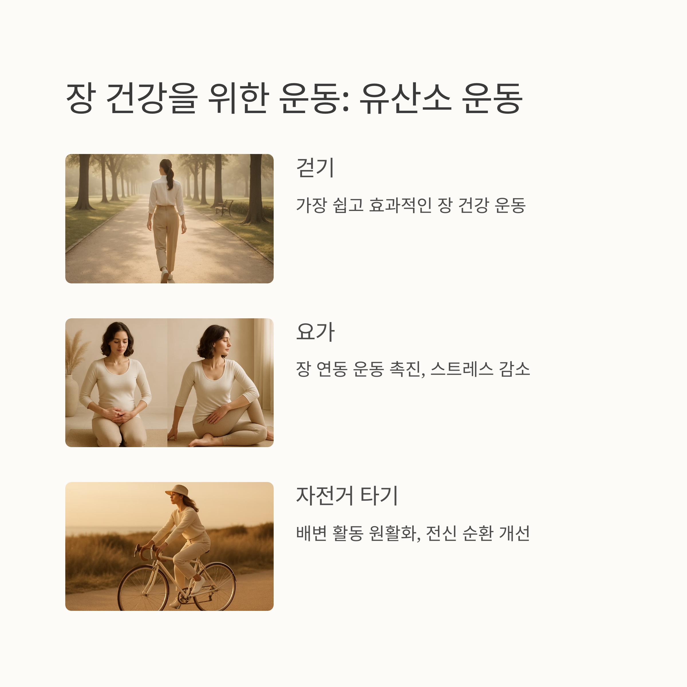 장 건강을 위해서는 식습관뿐 아니라 생활 습관도 중요합니다. 걷기, 요가, 자전거 타기 등의 유산소 운동은 장 연동 운동을 촉진하고 배변 활동을 원활하게 도와줘요. 하루 30분 이상 꾸준히 운동하는 것이 좋습니다. 명상이나 취미 생활, 충분한 수면을 통해 스트레스를 관리하는 것도 중요하답니다.