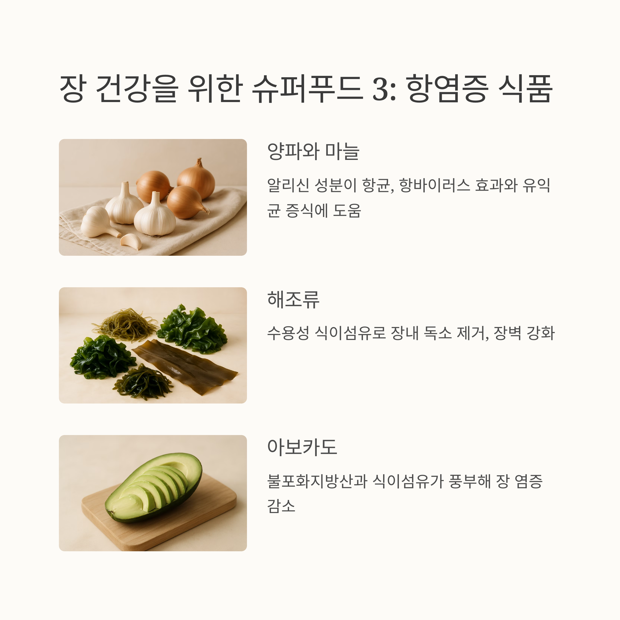 케일이나 브로콜리 같은 녹색 채소는 불용성 식이섬유가 풍부해서 장 운동을 활발하게 해주고, 양파와 마늘의 알리신 성분은 항균, 항바이러스 효과와 유익균 증식에도 도움을 준답니다. 미역, 다시마 같은 해조류도 빼놓을 수 없어요. 수용성 식이섬유가 풍부해서 장내 독소를 제거하고 장벽을 튼튼하게 해준답니다.