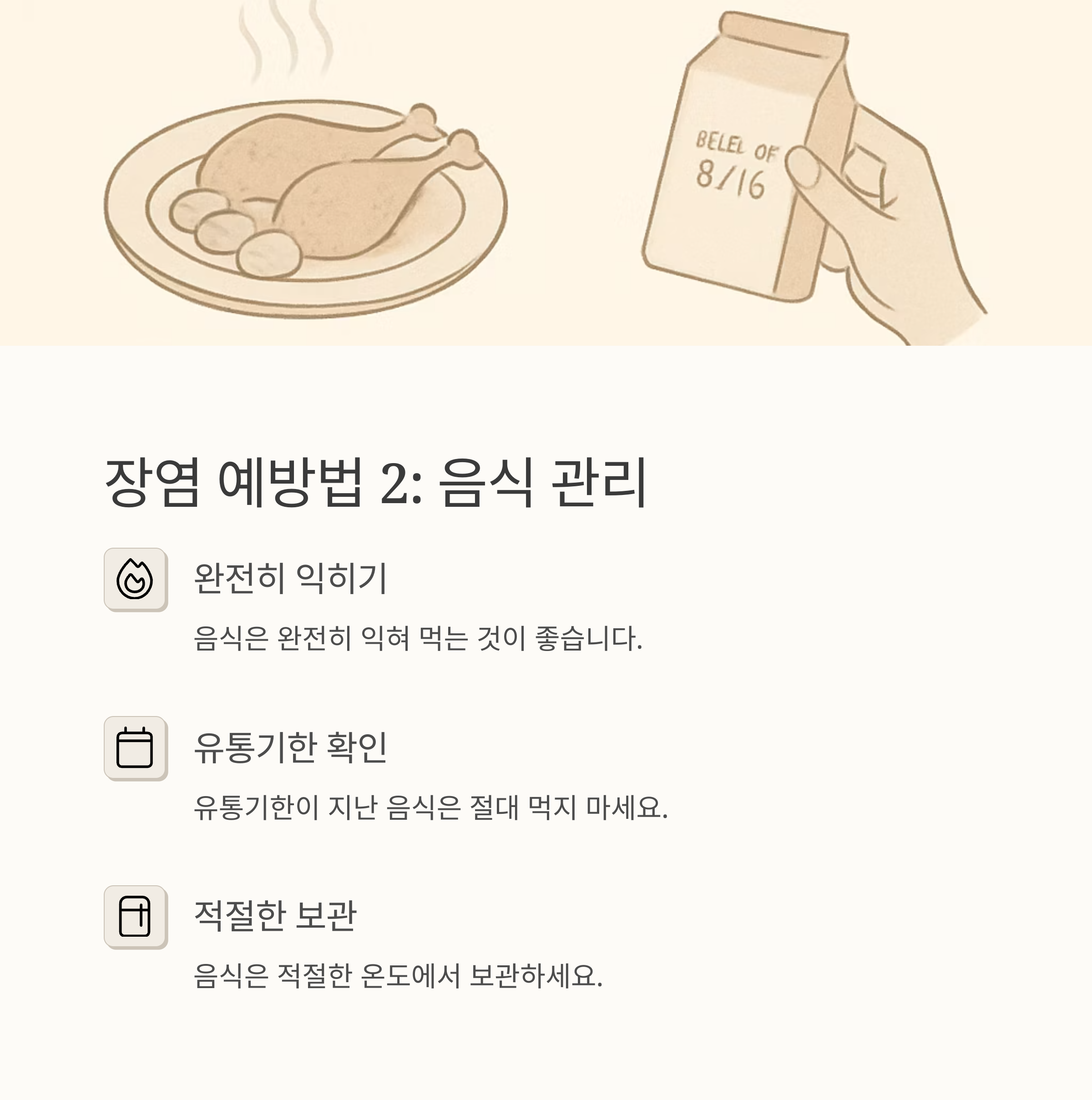 또, 물은 깨끗한 물을 마시고, 유통기한이 지난 음식은 절대 먹지 않도록 주의해야 해요. 평소에 건강한 식습관과 규칙적인 운동으로 면역력을 높이는 것도 장염 예방에 도움이 된답니다. 장염은 예방이 최선이니, 위생적인 생활 습관을 꾸준히 실천해보세요.
