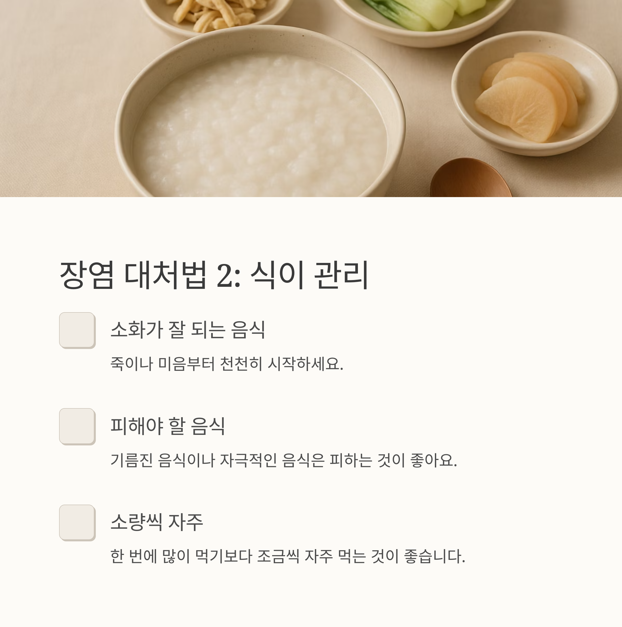 음식은 소화가 잘 되는 죽이나 미음 같은 것부터 천천히 시작하고, 기름진 음식이나 자극적인 음식은 피하는 것이 좋아요. 그리고 몸에 힘이 많이 빠져있다면 무리하지 말고 충분히 쉬어주는 것이 중요하고요. 증상이 심하거나 오래 지속된다면 병원에 가서 진료를 받는 것을 잊지 마세요. 가벼운 장염도 방치하면 심각해질 수 있다는 점, 꼭 기억하세요.
