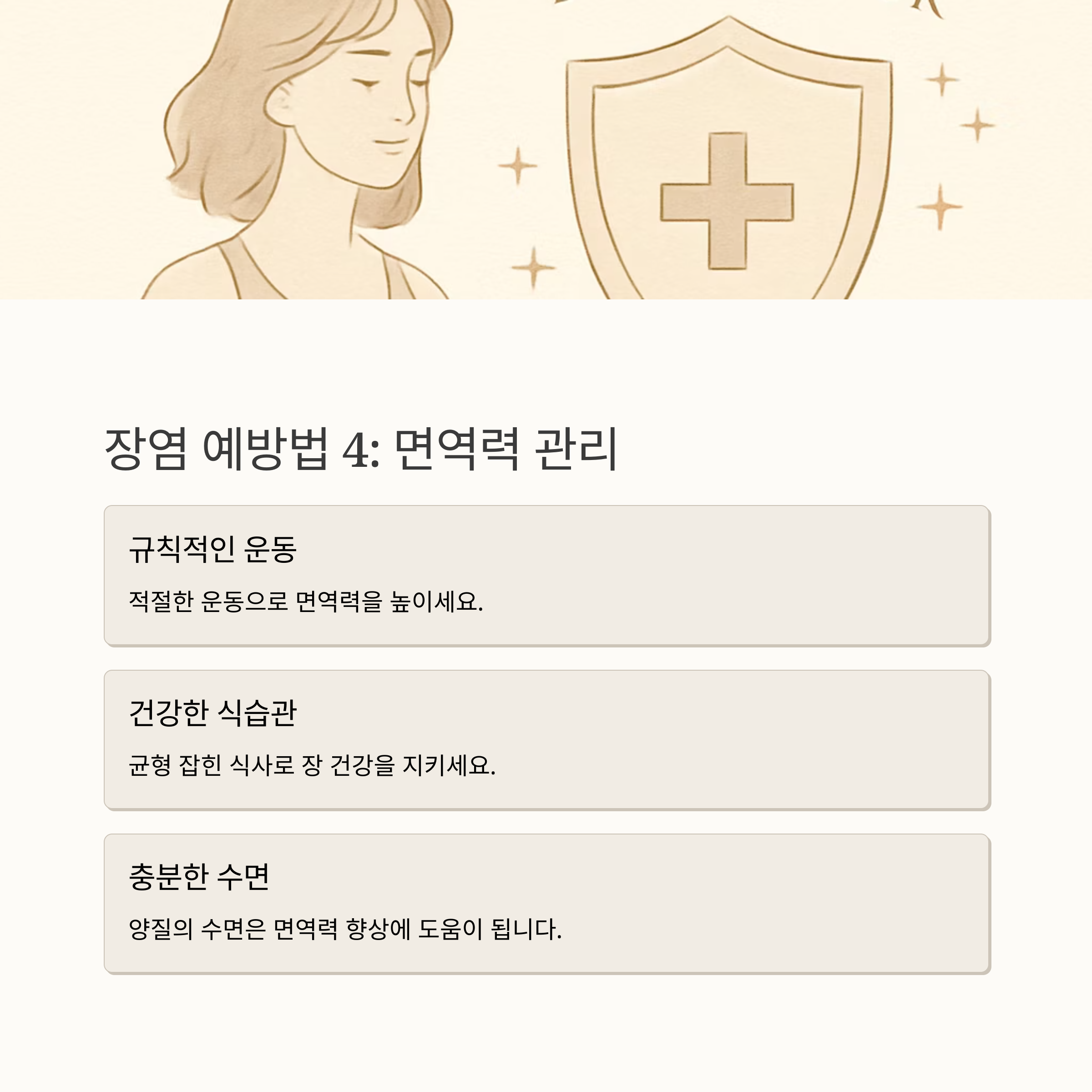 장염을 예방하려면 평소 위생 관리에 신경 쓰는 것이 중요해요. 외출 후나 식사 전후에 흐르는 물에 비누로 꼼꼼하게 손을 씻는 습관을 들이고, 음식은 완전히 익혀 먹는 것이 좋습니다.