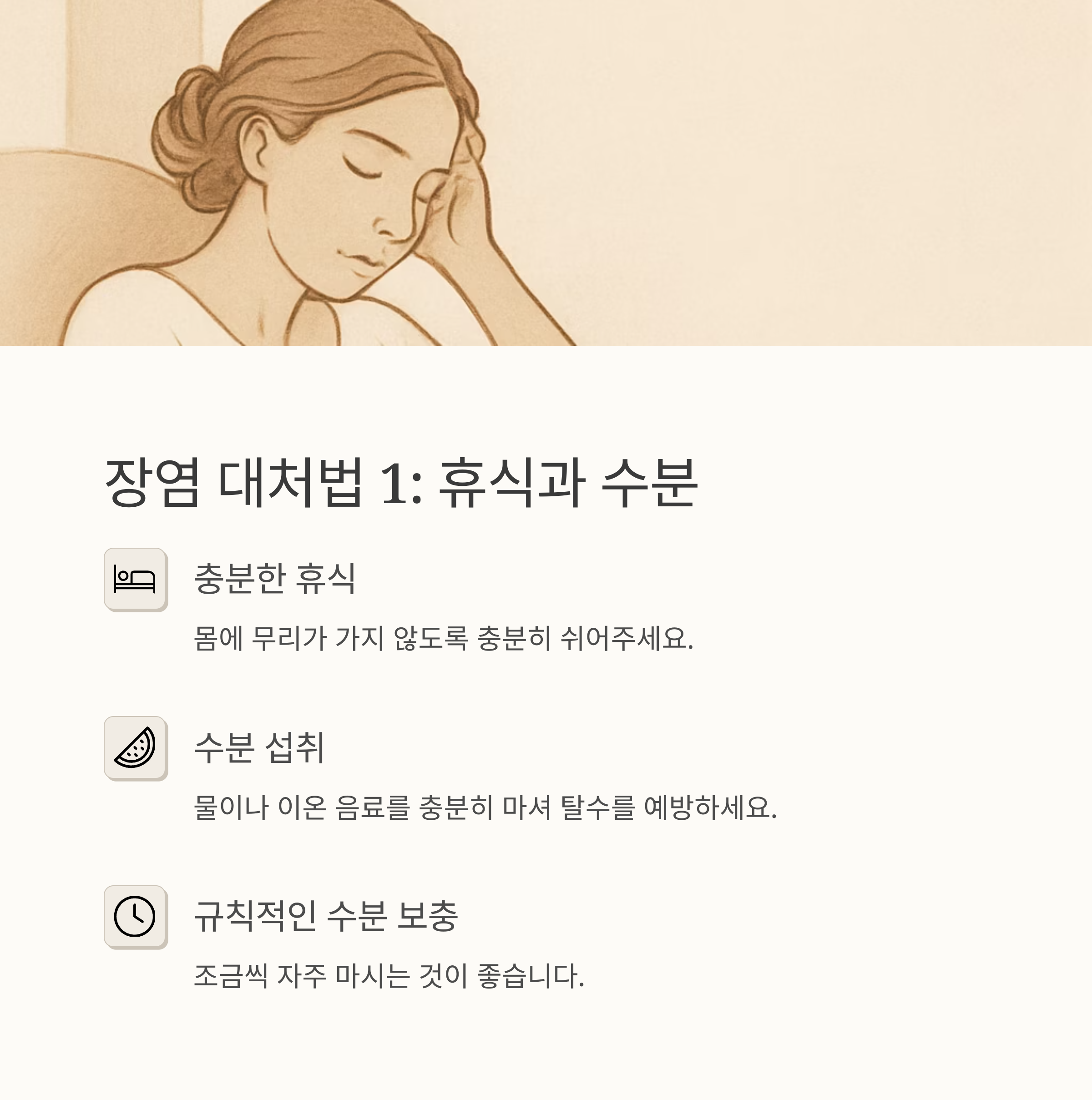 장염이 의심되면 우선 충분한 휴식을 취하는 것이 중요해요. 그리고 가장 중요한 건 수분 섭취! 설사와 구토로 수분이 많이 빠져나가기 때문에 물이나 이온 음료를 충분히 마셔서 탈수를 예방해야 해요.