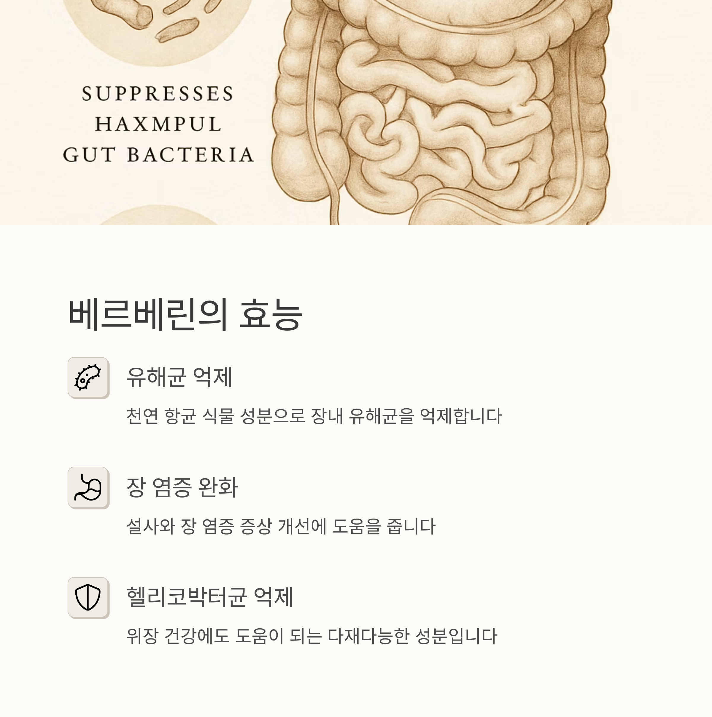 먼저 베르베린은 천연 항균 식물 성분으로, 장내 유해균 억제에 탁월해요. 설사나 장 염증에도 도움이 되고, 헬리코박터균 억제에도 효과가 있다고 하니 일석이조죠! 다음은 L-카르노신인데요, 장 점막 보호에 탁월하고 위 자극까지 완화해 준다고 하네요. 스트레스성 위염이나 소화불량이 잦은 분들에게 특히 추천해요.