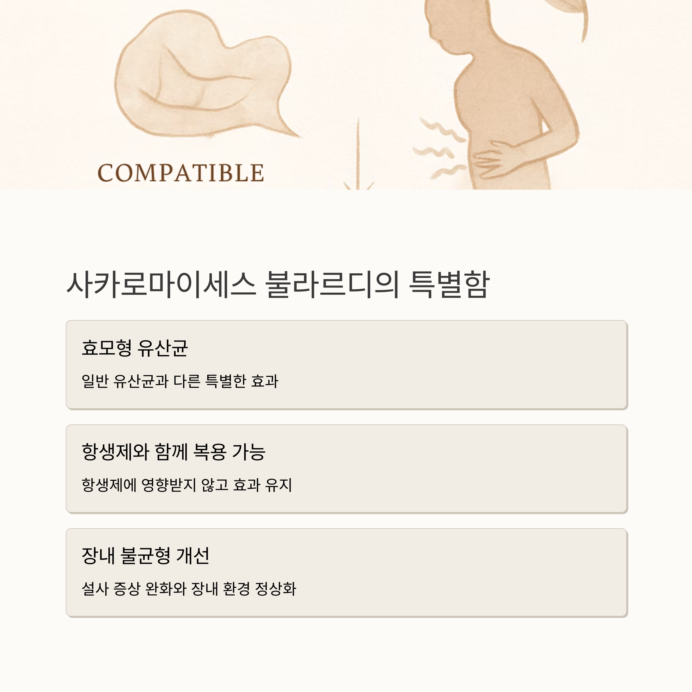 마지막으로 사카로마이세스 불라르디는 효모 형 유산균으로, 항생제 복용 중에도 안전하게 먹을 수 있고, 설사나 장내 불균형 개선에 도움이 된다고 합니다. 각 성분의 효과, 추천 이유, 그리고 권장 섭취량까지 꼼꼼하게 설명해 드렸으니, 내게 맞는 영양제를 찾아보세요!