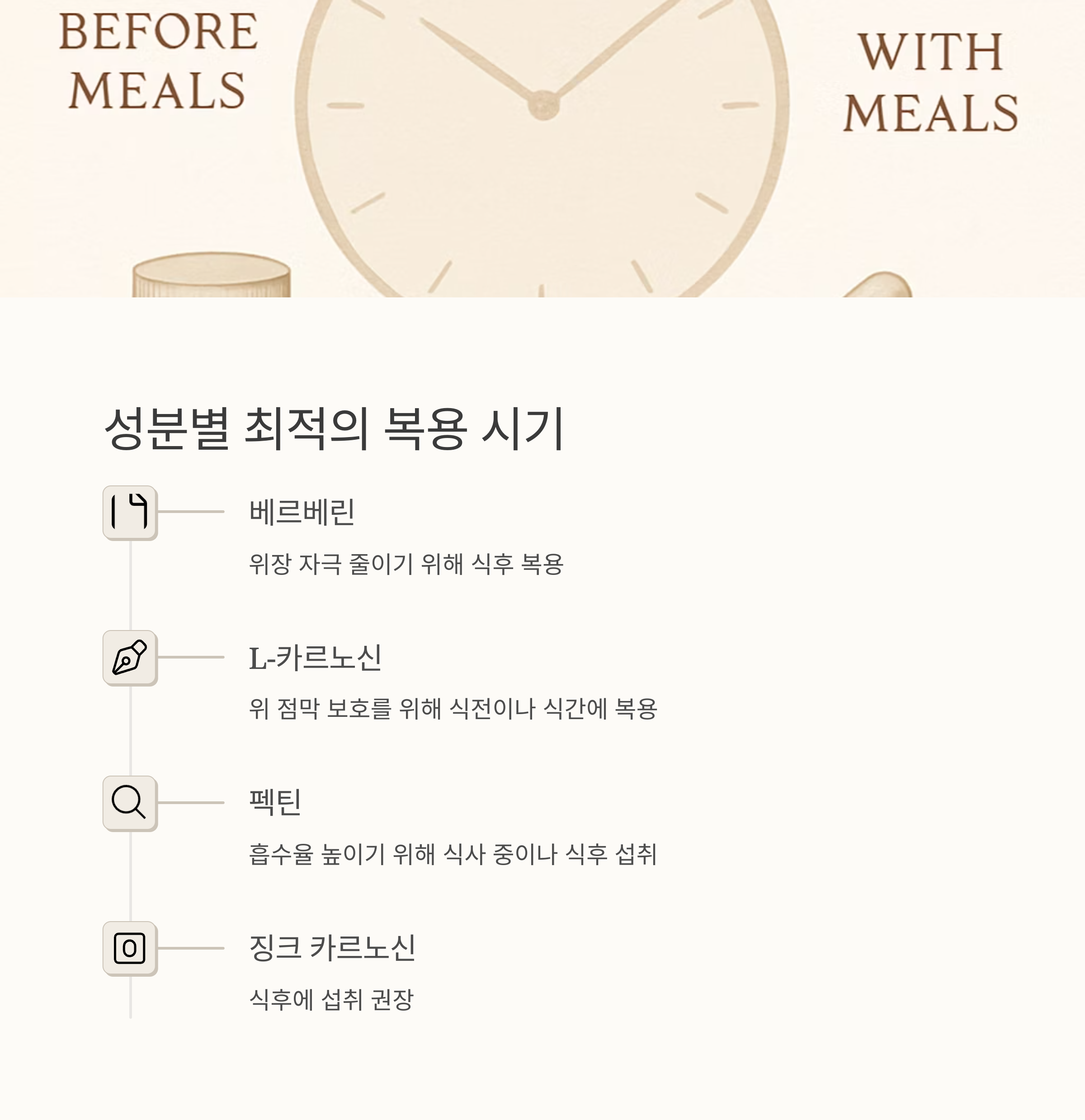 그리고 성분별 복용 시기를 확인하는 것도 중요해요. 베르베린은 위장 자극을 줄이기 위해 식후에, L-카르노신은 위 점막 보호를 위해 식전이나 식간에 복용하는 것이 좋고, 펙틴은 식사 중이나 식후에 섭취하는 것이 흡수율을 높일 수 있습니다. 징크 카르노신도 식후에 섭취하는 것이 좋고요.