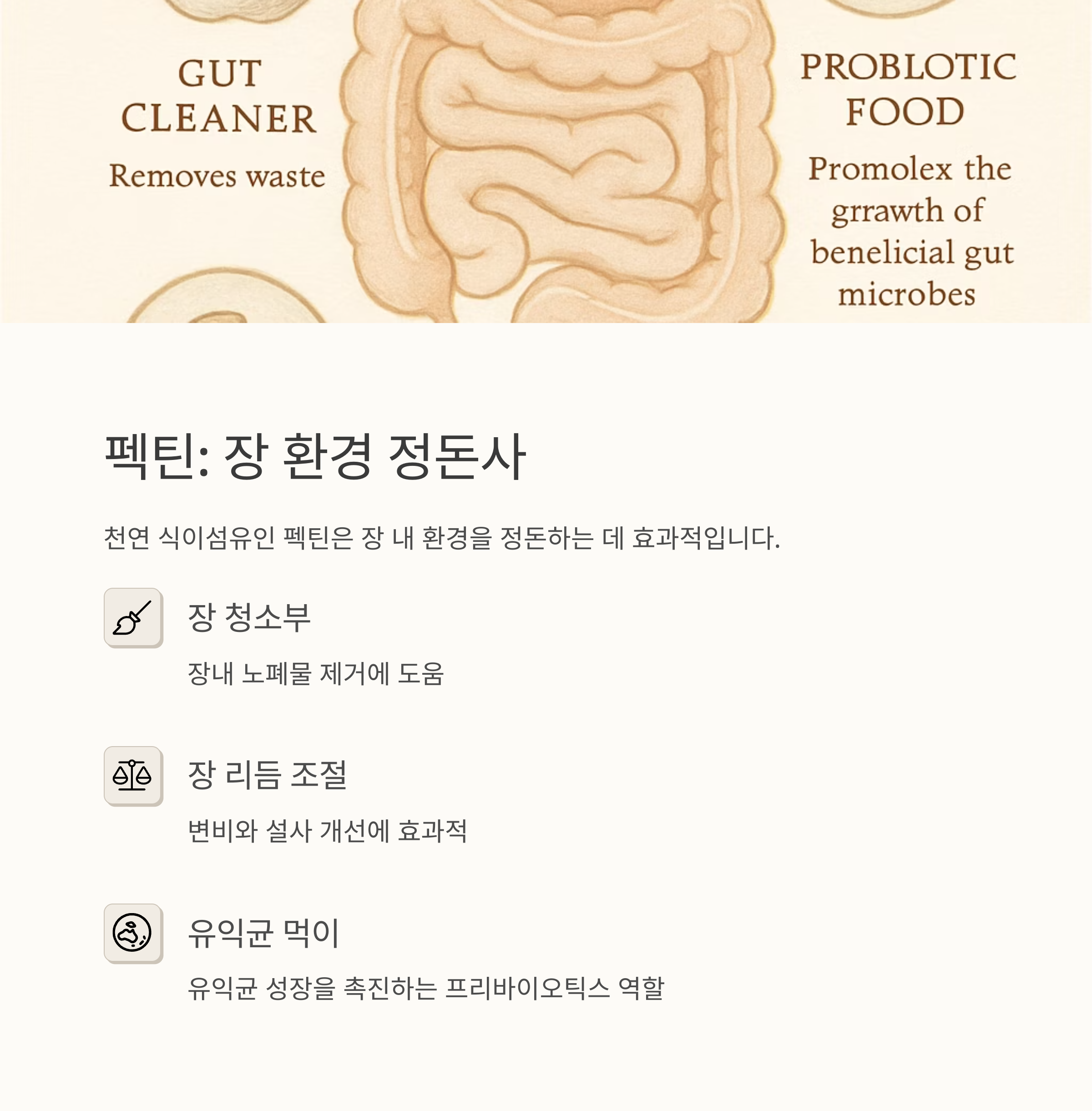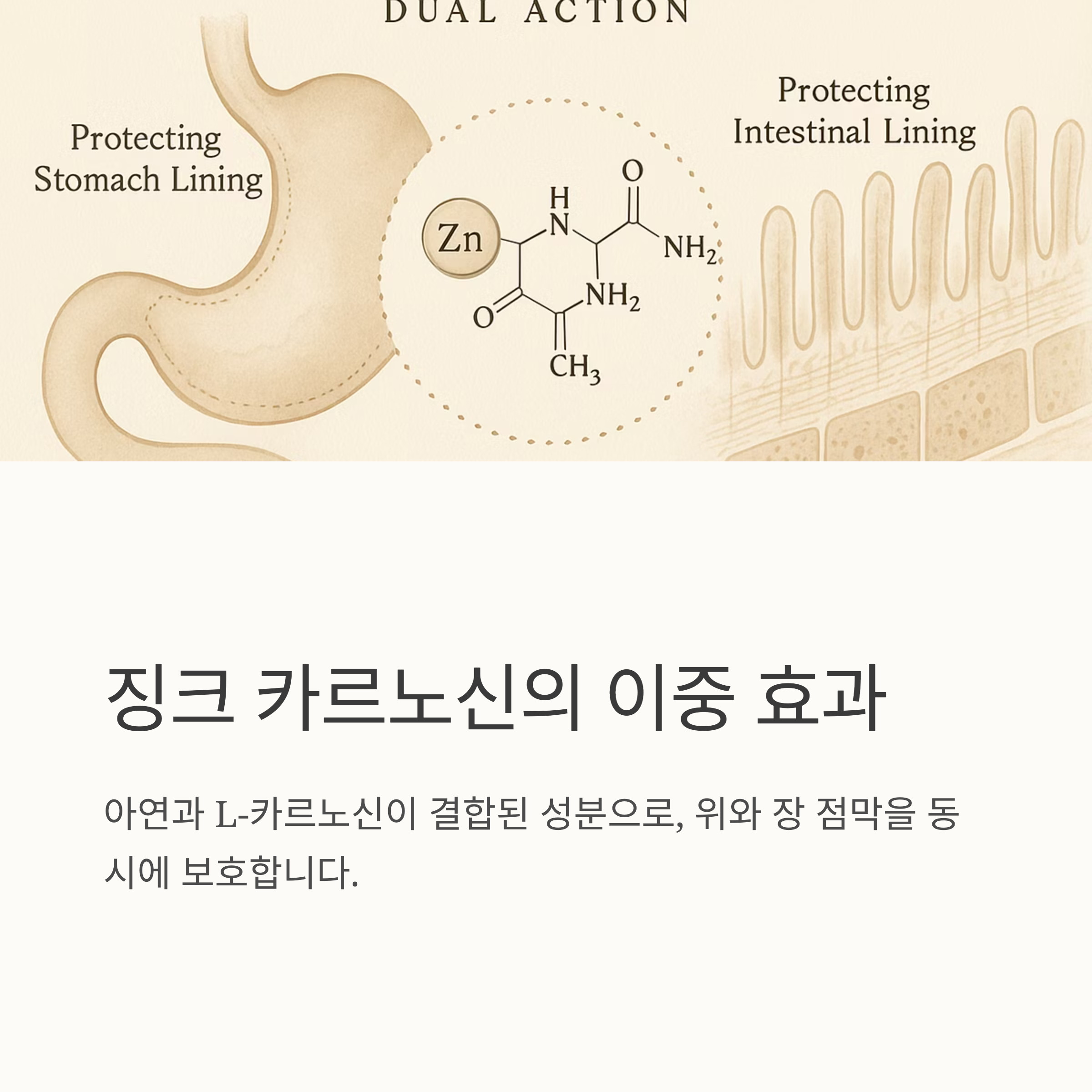 펙틴은 천연 식이섬유로, 장 내 환경을 정돈하는 데 효과적이에요. 장이 자주 더부룩하거나 변비, 설사가 반복되는 분들에게 딱이죠! 그리고 징크 카르노신은 아연과 L-카르노신이 결합된 성분으로, 위와 장 점막을 동시에 보호해준대요. 위염이나 장염으로 고생하는 분들에게 좋을 것 같아요.