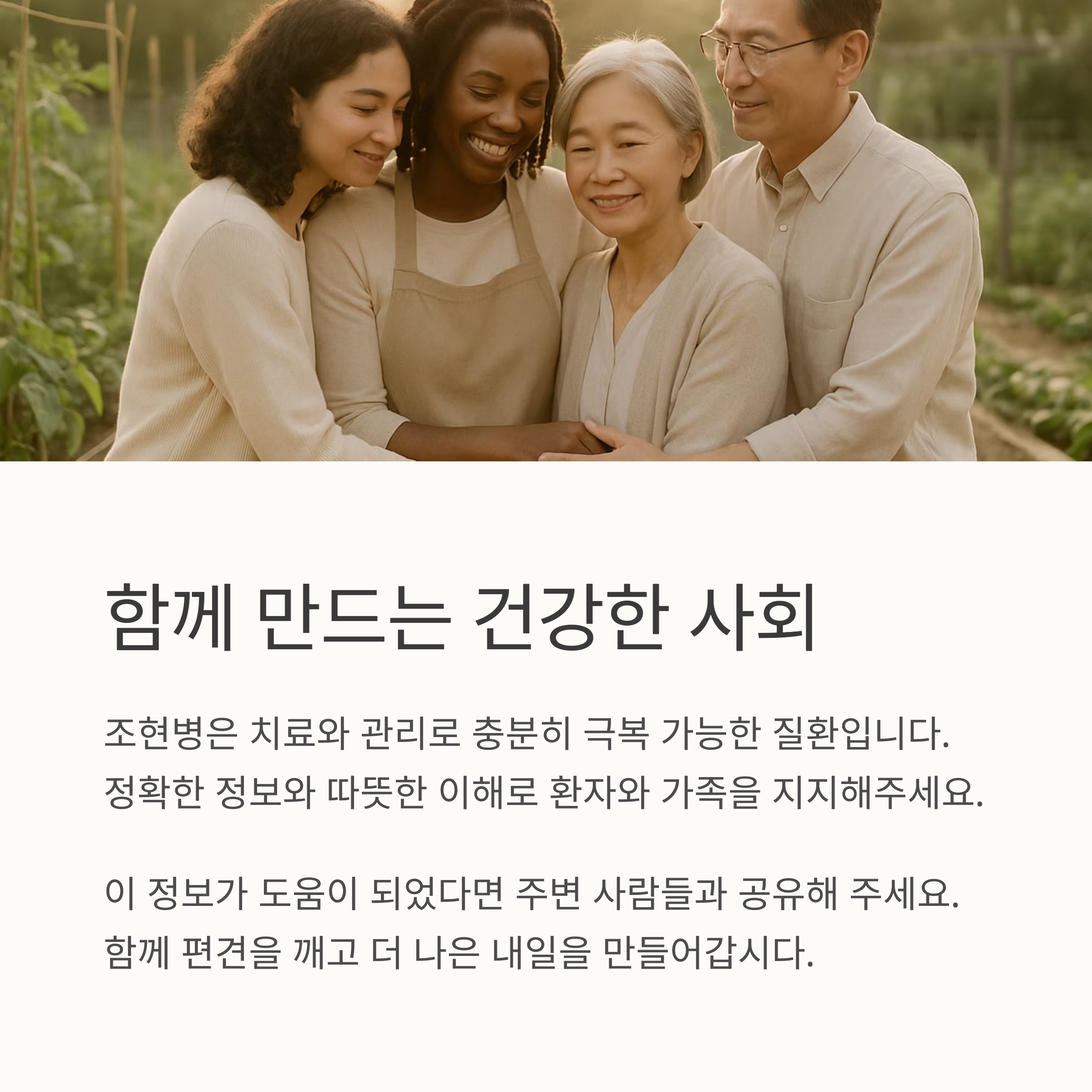 지금까지 조현병 원인에 대한 다양한 정보를 나누었습니다. 조현병은 쉽게 이해하기 어려운 질환이지만, 정확한 정보와 따뜻한 마음으로 다가간다면 충분히 극복할 수 있는 질환입니다. 환자와 가족 모두에게 힘이 되어주는 사회 분위기가 만들어진다면 더욱 건강한 삶을 유지할 수 있을 것입니다. 함께 더 나은 내일을 만들어가요.