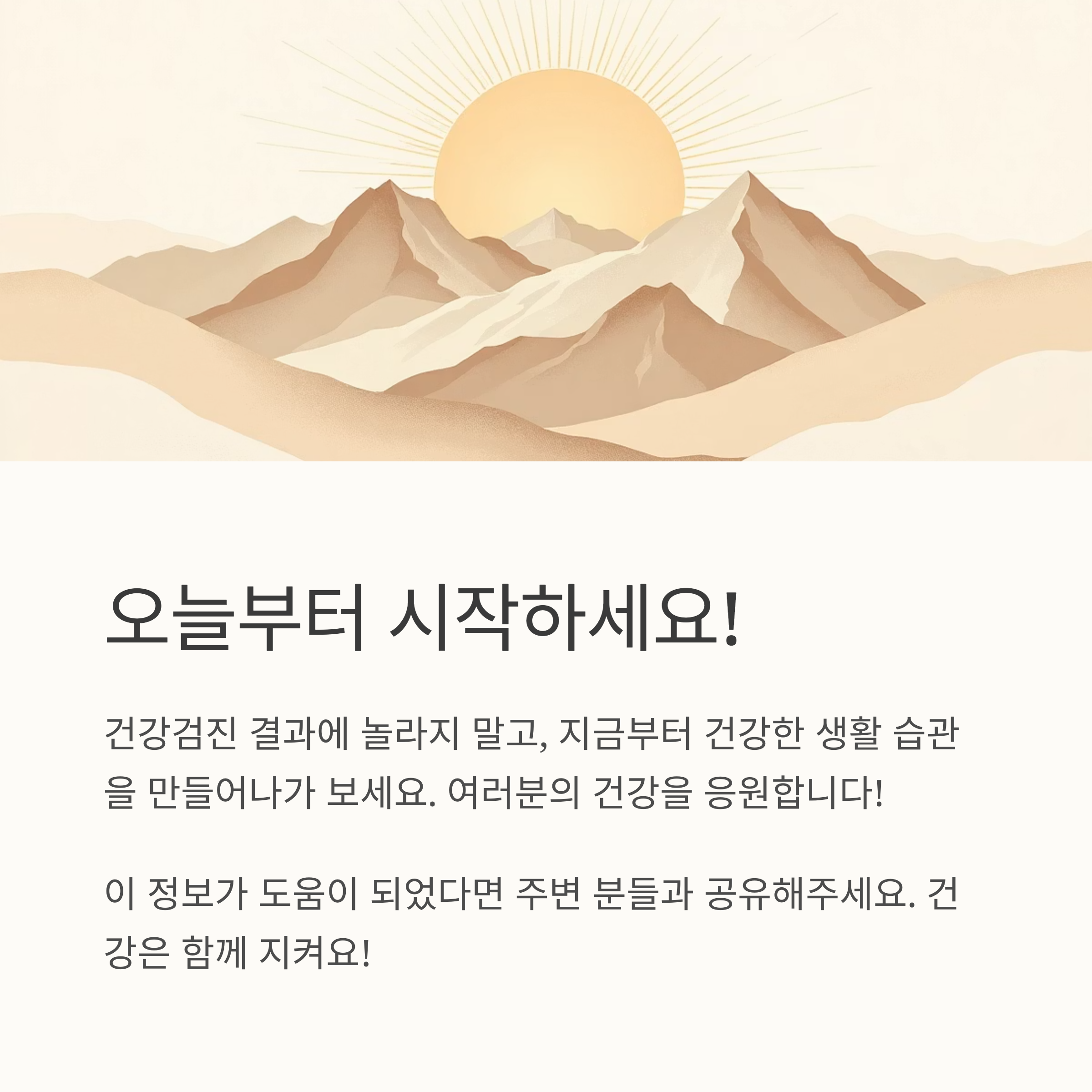 그래서 저도 정신 바짝 차리고 생활 습관을 바꾸기 시작했어요. 여러분도 저처럼 당황하지 말고, 지금부터라도 관리 시작하는 게 가장 중요합니다! 자신의 수치가 어느 정도인지 정확히 알고 어떻게 대처해야 할지 생각해 보세요. 어렵지 않아요! 함께 해봐요.