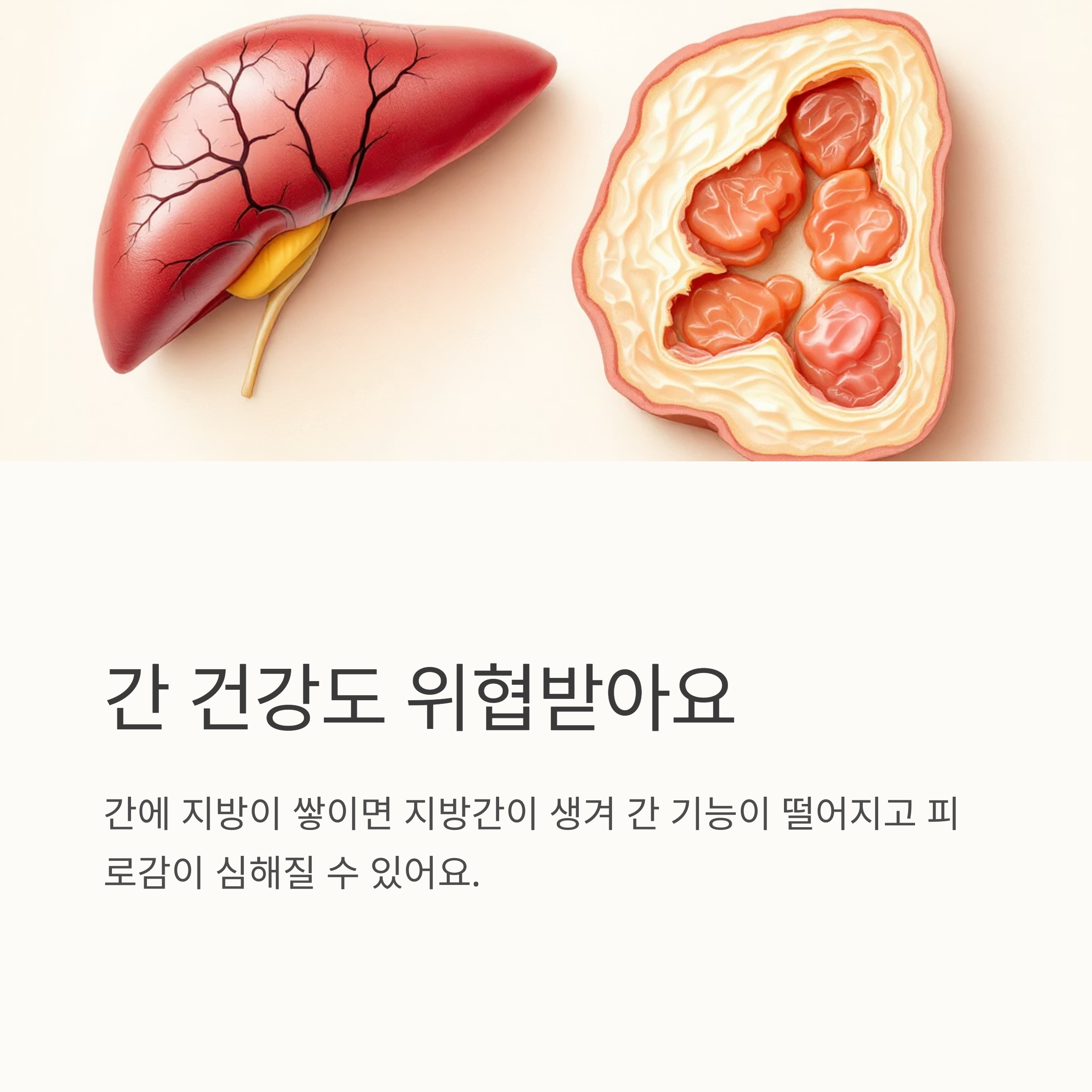 또, 간에도 문제가 생길 수 있는데요. 간에 지방이 쌓이면 지방간이 생겨 간 기능이 떨어지고 피로감이 심해질 수 있어요. 그리고 췌장염도 위험해요. 췌장염은 극심한 복통을 유발하는 무서운 질병이거든요.