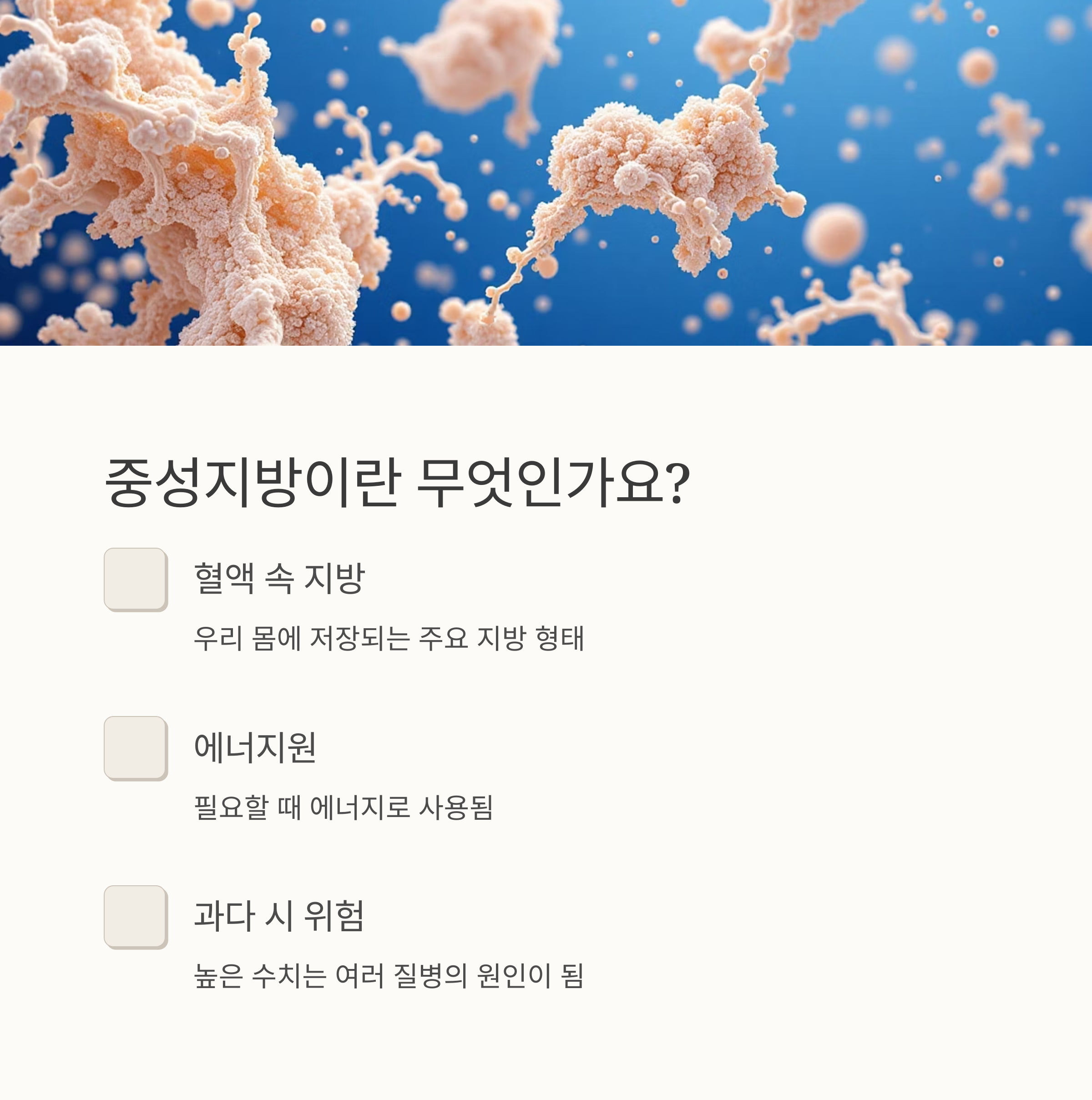 안녕하세요. 여러분의 건강한 삶을 응원하는 블로그에 오신 것을 환영합니다. 오늘은 건강검진에서 흔히 접하지만, 간과하기 쉬운 중성지방에 대해 자세히 알아보고, 특히 수치가 높을 때 어떻게 관리해야 하는지 함께 이야기 나눠보도록 하겠습니다. 건강검진 결과를 받아보고 깜짝 놀라셨나요? 걱정 마세요. 이 글이 여러분의 건강 멘토가 되어 드릴게요!