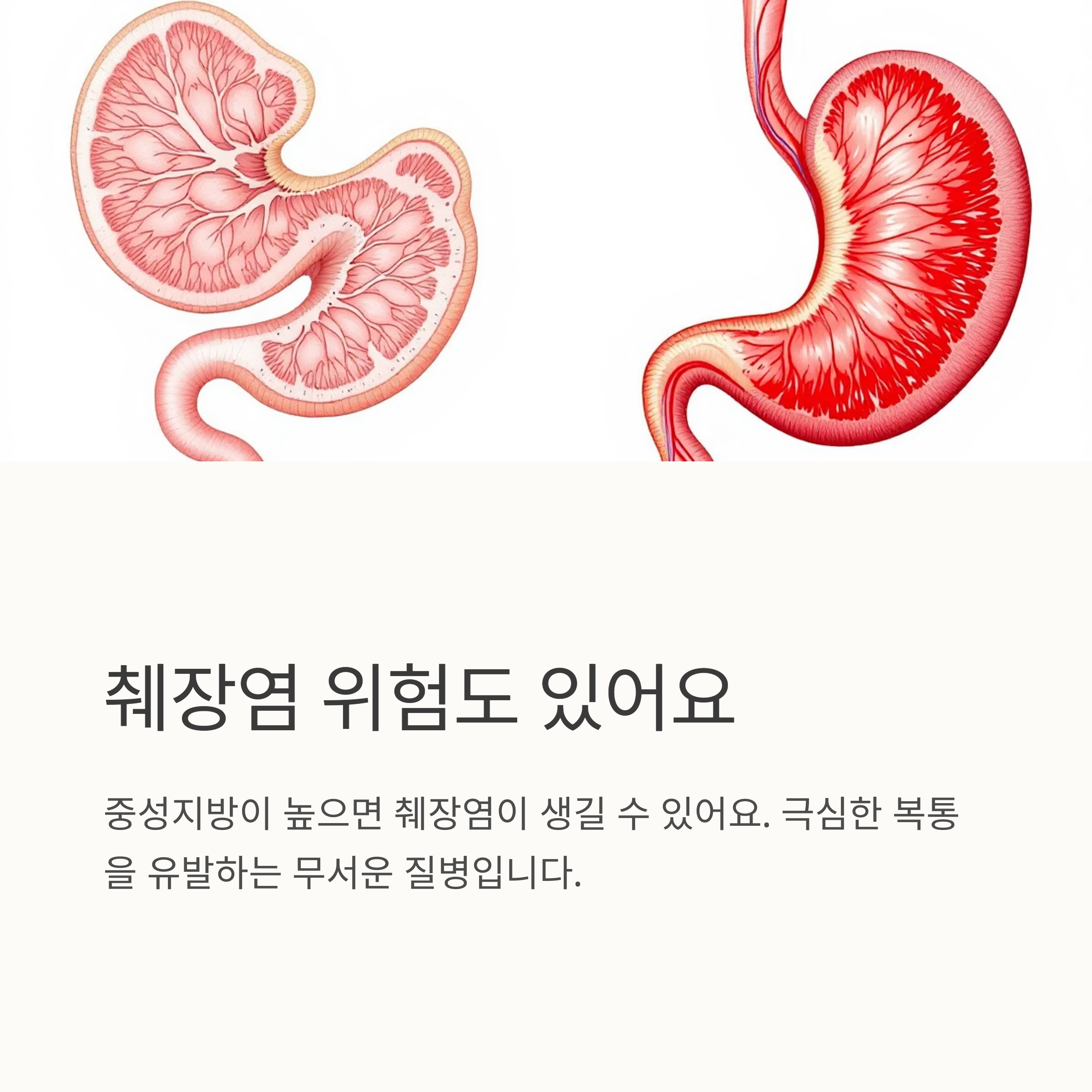 또, 간에도 문제가 생길 수 있는데요. 간에 지방이 쌓이면 지방간이 생겨 간 기능이 떨어지고 피로감이 심해질 수 있어요. 그리고 췌장염도 위험해요. 췌장염은 극심한 복통을 유발하는 무서운 질병이거든요.