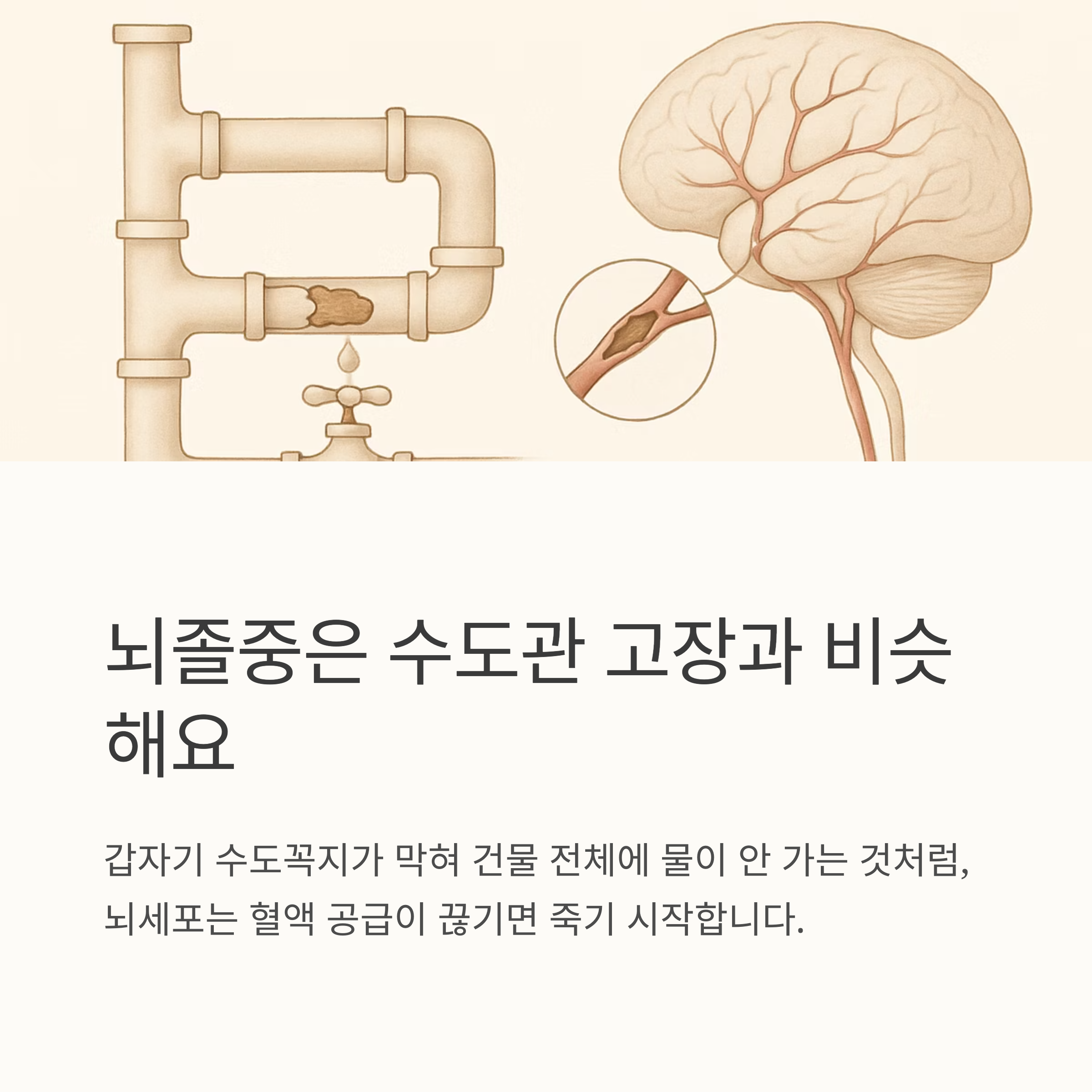 뇌졸중이라는 건, 뇌로 가는 혈액 공급이 갑자기 막히거나 터져서 뇌세포가 손상되는 무서운 병이에요. 갑자기 수도꼭지가 막혀서 건물 전체에 물이 안 가는 것과 비슷하다고 생각하면 쉬워요. 뇌세포는 산소와 영양분을 혈액으로부터 공급받는데, 혈액 공급이 끊기면 뇌세포가 죽기 시작하고, 그로 인해 여러 가지 심각한 문제가 발생하는 거죠.