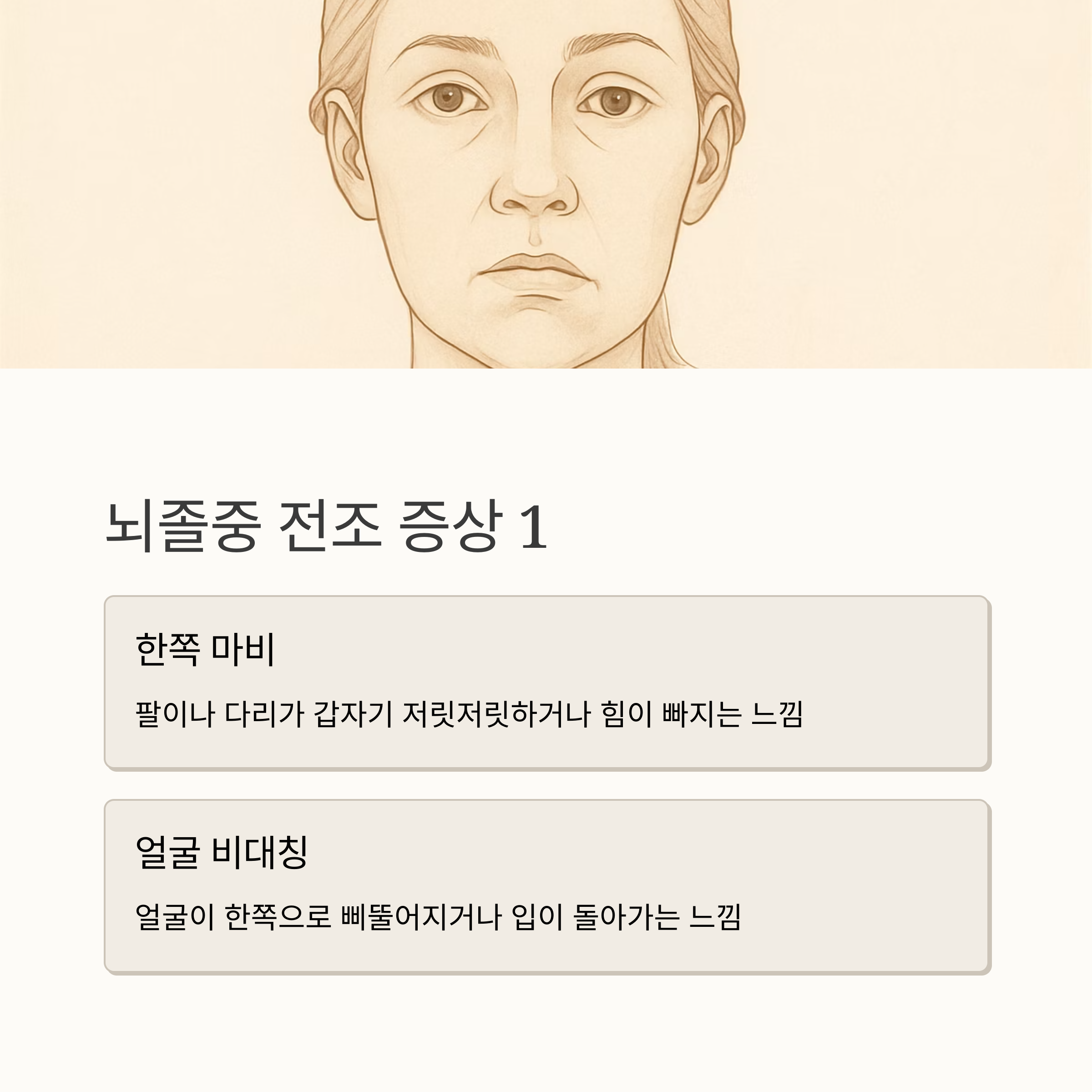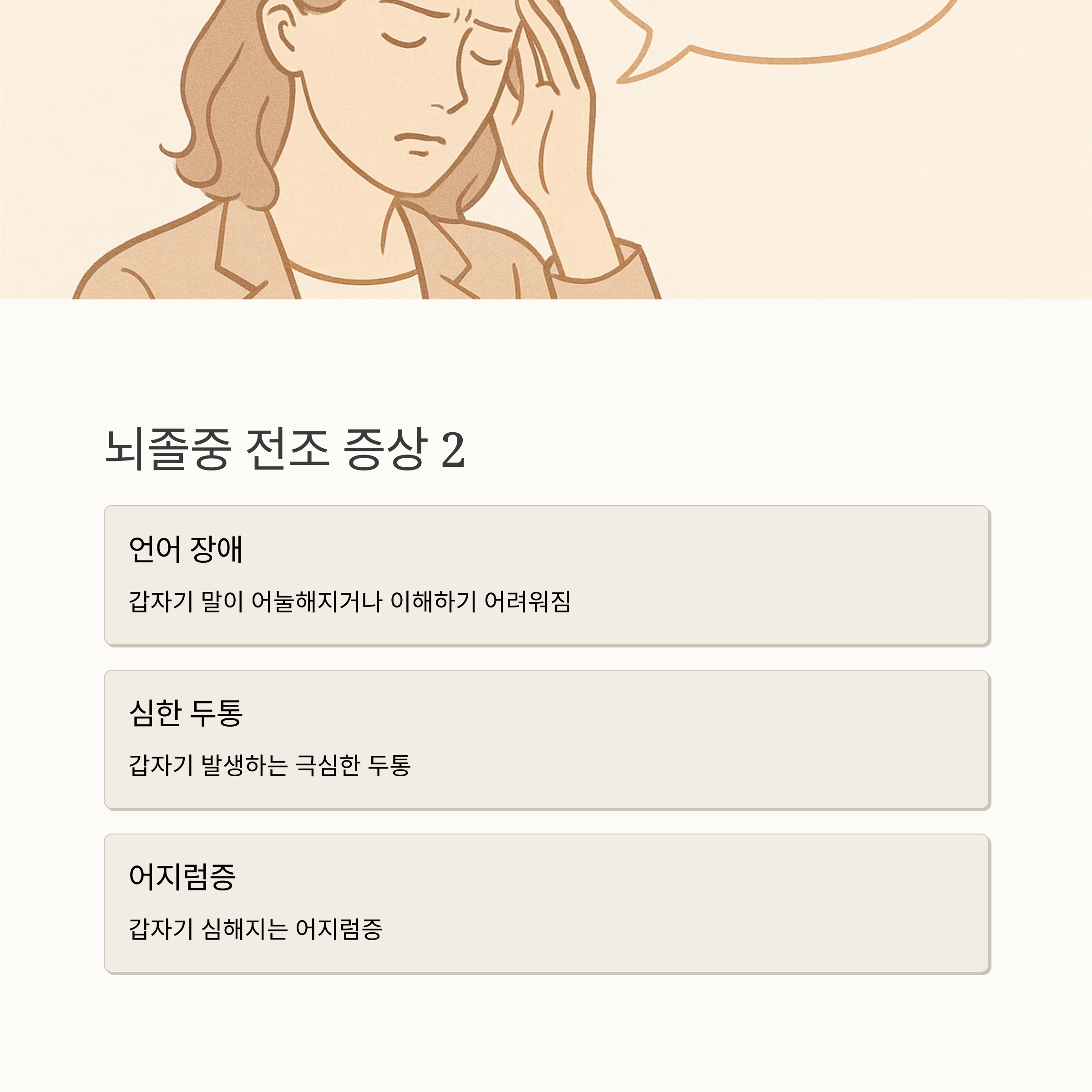 뇌졸중은 어느 날 갑자기 찾아오는 게 아니라, 사전에 몇 가지 전조 증상을 보이는 경우가 많아요. 이 전조 증상들을 놓치지 않는 것이 중요해요. 어떤 증상들이 있냐면요, 예를 들어 한쪽 팔이나 다리가 갑자기 저릿저릿하거나 힘이 빠지는 느낌, 얼굴이 한쪽으로 삐뚤어지거나 입이 돌아가는 느낌, 갑자기 말이 어눌해지거나 이해하기 어려워지는 경우, 심한 두통이 갑자기 생기는 경우, 혹은 갑자기 어지럼증이 심해지는 경우 등이 있답니다.