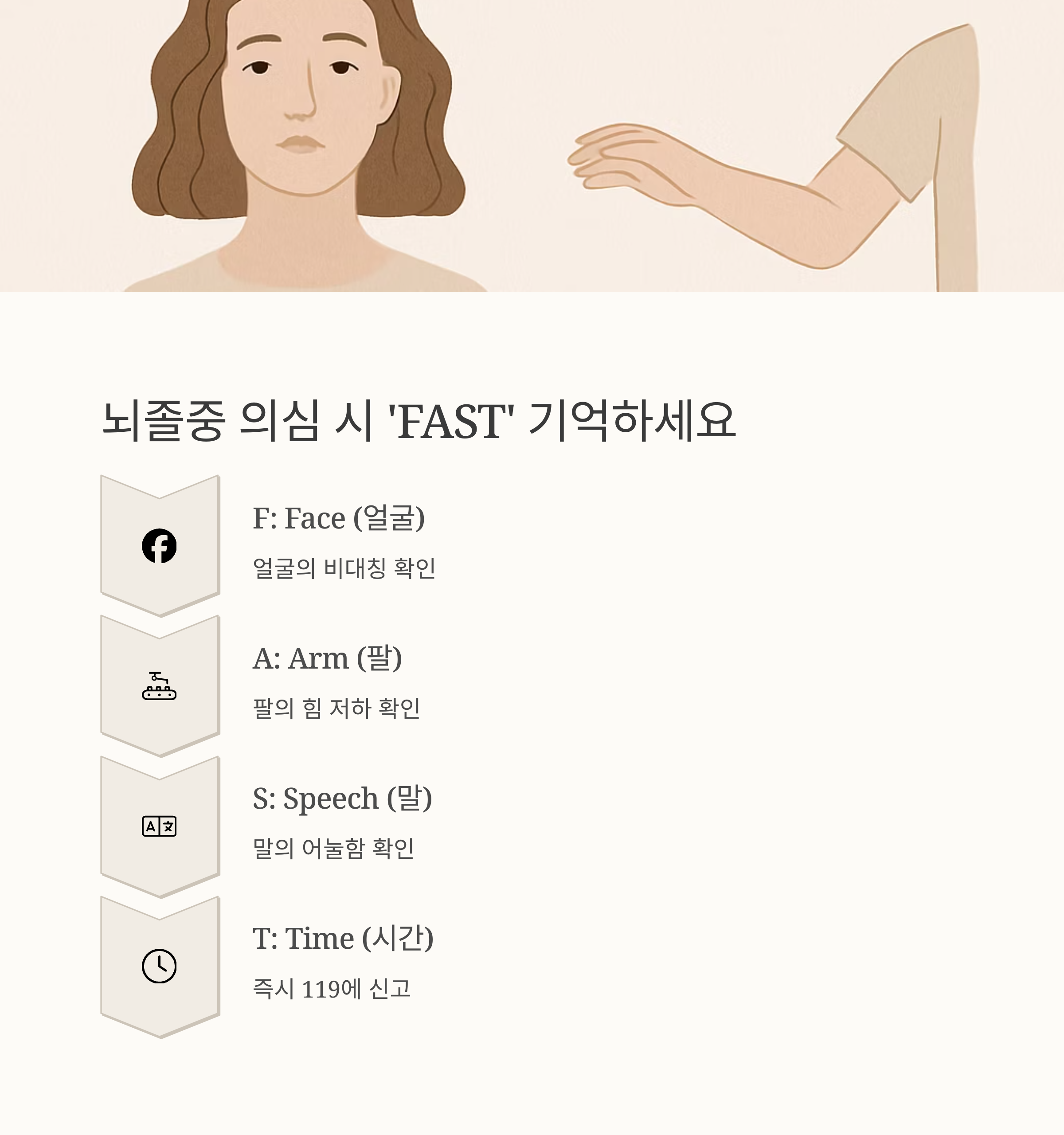만약 뇌졸중이 의심되는 증상이 나타난다면, 'FAST'라는 간단한 방법을 기억하세요. 'F'는 얼굴(Face)의 비대칭, 'A'는 팔(Arm)의 힘 저하, 'S'는 말(Speech)의 어눌함, 'T'는 시간(Time)을 의미해요. 이러한 증상이 보인다면, 즉시 119에 신고하거나 응급실로 가야 해요.