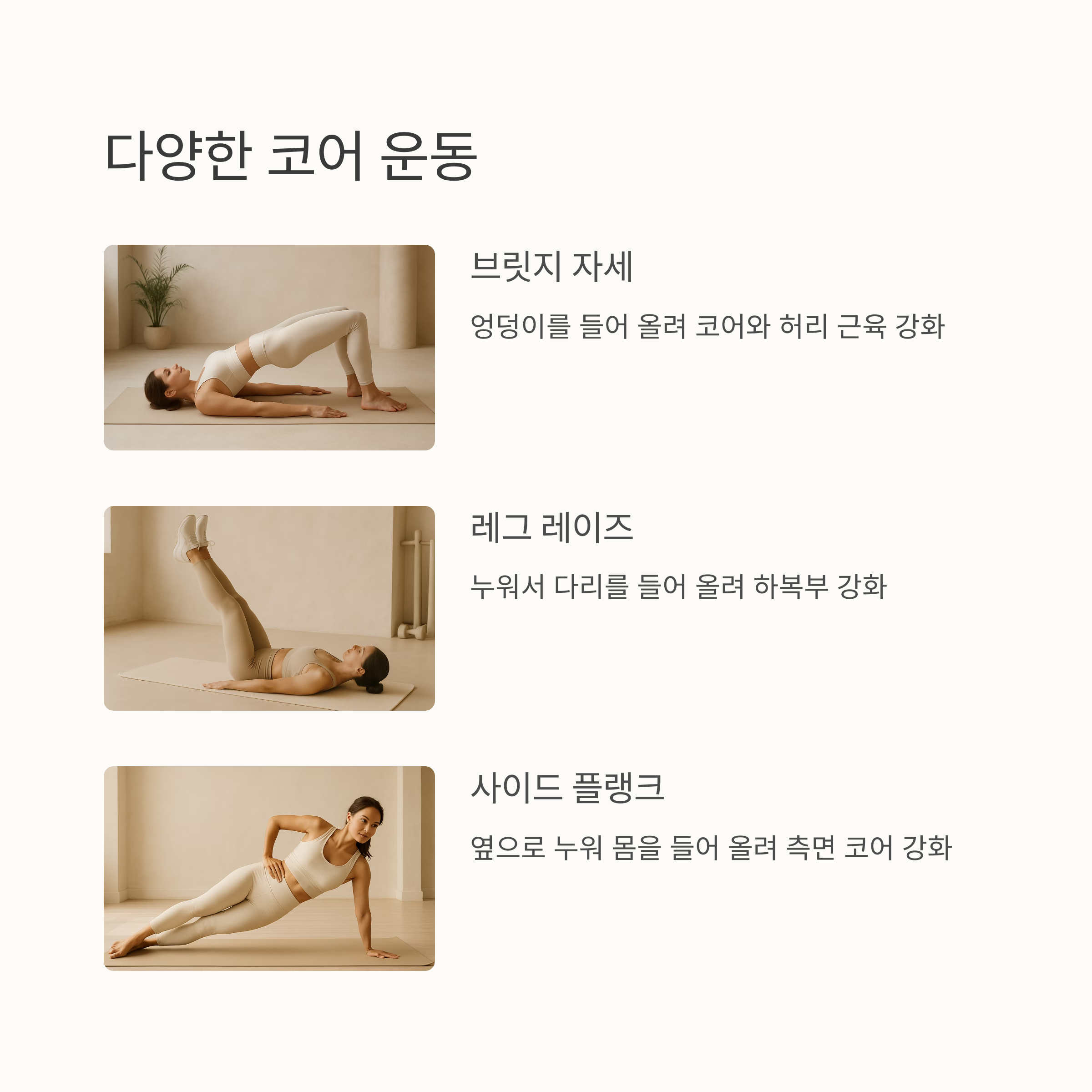 플랭크 자세 외에도 브릿지 자세나 레그 레이즈와 같은 코어 운동을 병행하면 더욱 좋은 효과를 볼 수 있습니다. 이 운동들은 척추를 안정적으로 지지해 주는 근육들을 강화하여 척추관 협착증 예방에 도움이 됩니다.