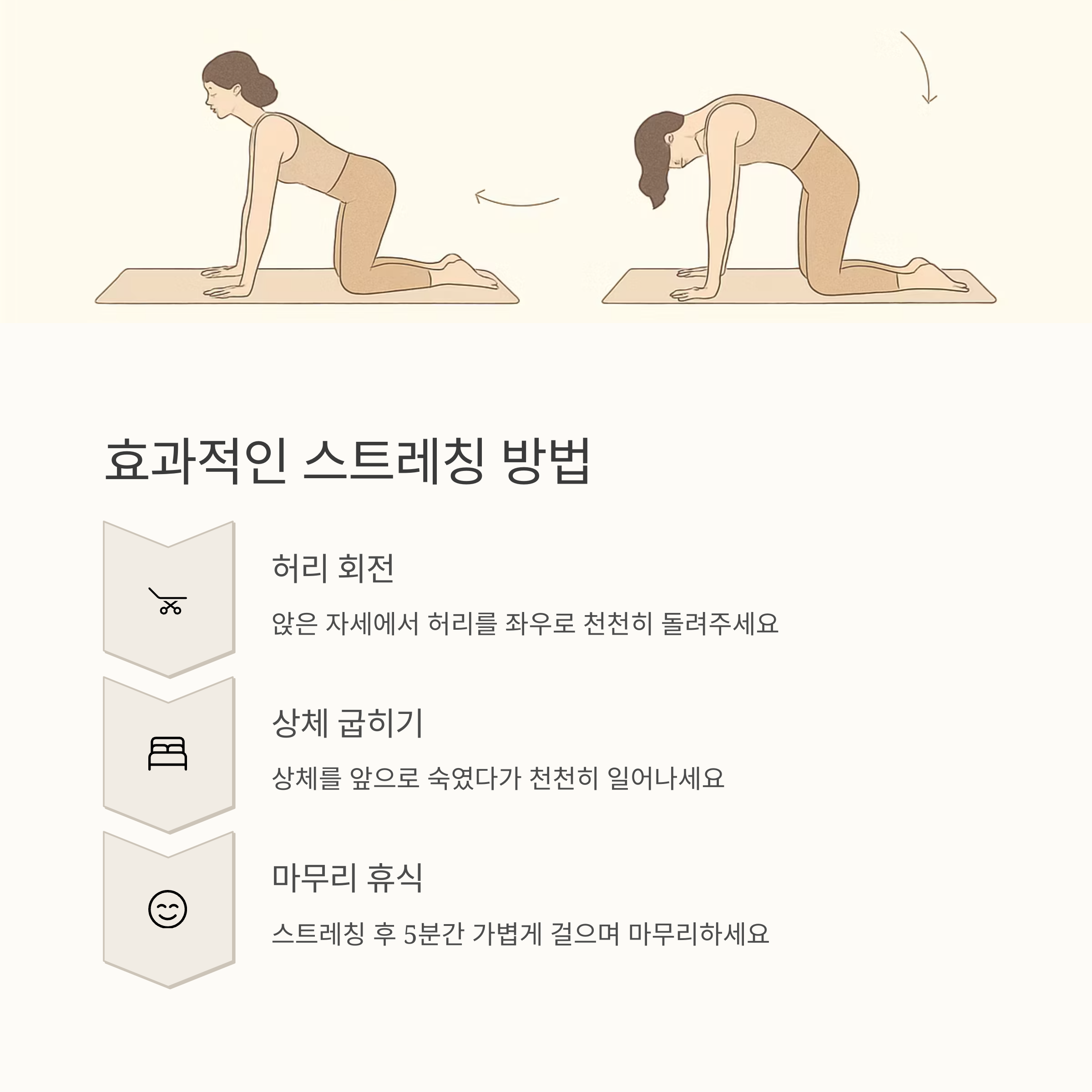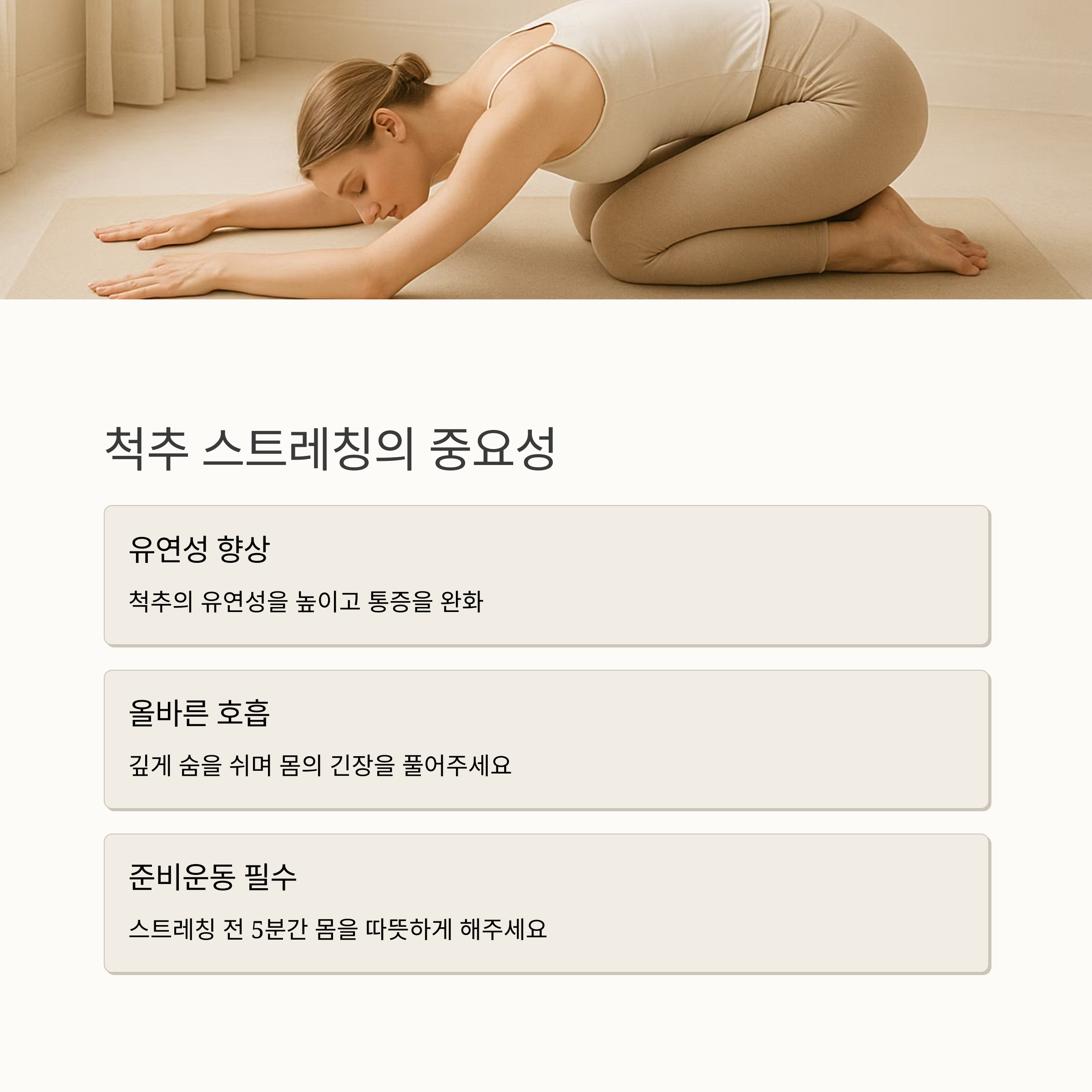 하지만 무리하게 스트레칭을 하면 오히려 척추에 부담이 갈 수 있으니, 항상 본인의 몸 상태를 확인하면서 천천히, 부드럽게 스트레칭을 해야 해요. 그리고 스트레칭을 할 때는 숨을 크게 들이쉬고 내쉬면서 몸의 긴장을 풀어주는 것이 중요해요. 스트레칭을 하기 전에는 가볍게 몸을 풀어주는 준비 운동을 5분 정도 해주세요.