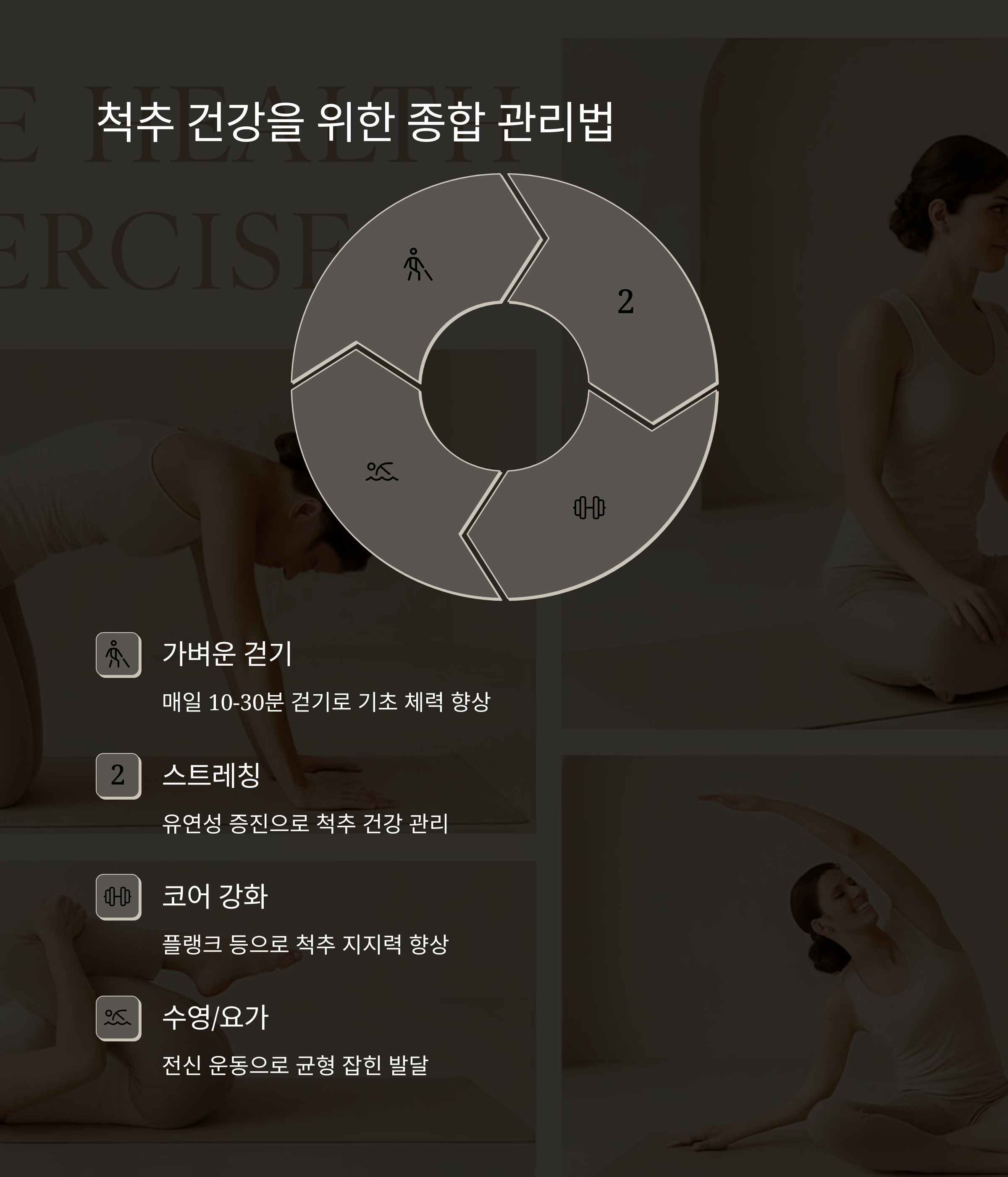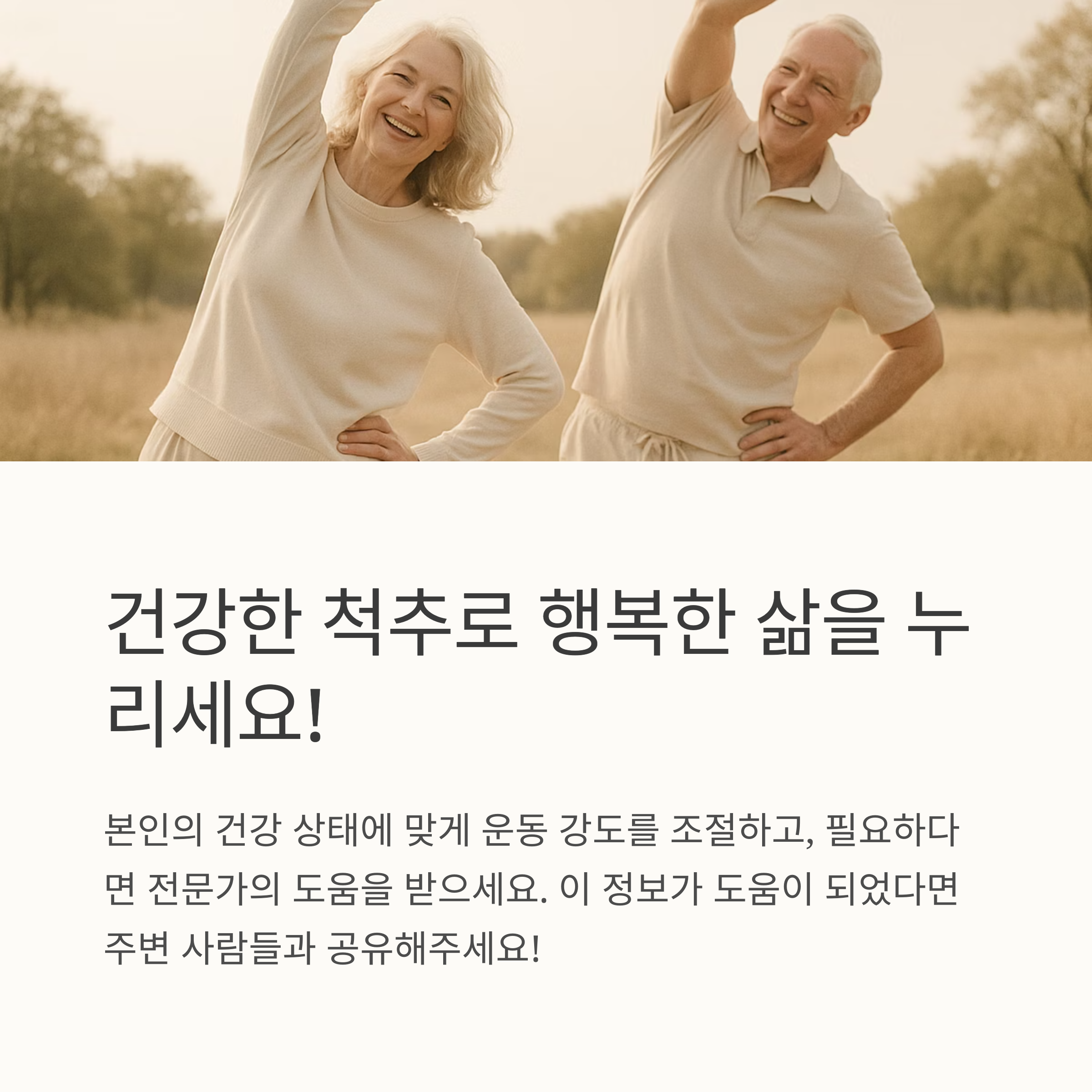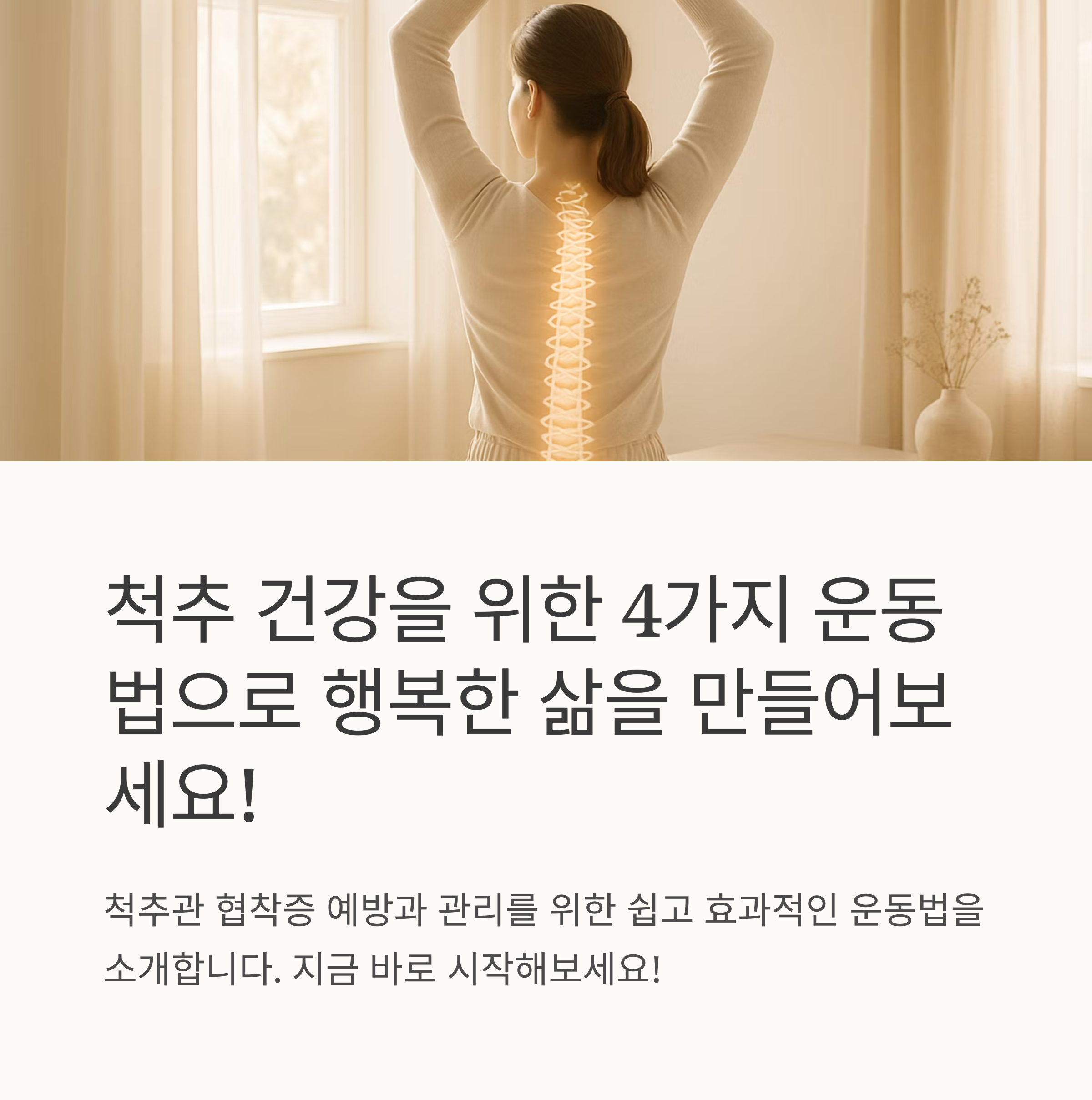 척추 건강과 행복한 삶, 함께 만들어가요! 척추관 협착증 예방과 관리에 도움이 될 4가지 척추관 협착증 운동법을 알려드릴게요. 쉽고, 재밌게 따라 하실 수 있도록 친절하게 설명해 드릴 테니, 걱정 마세요!