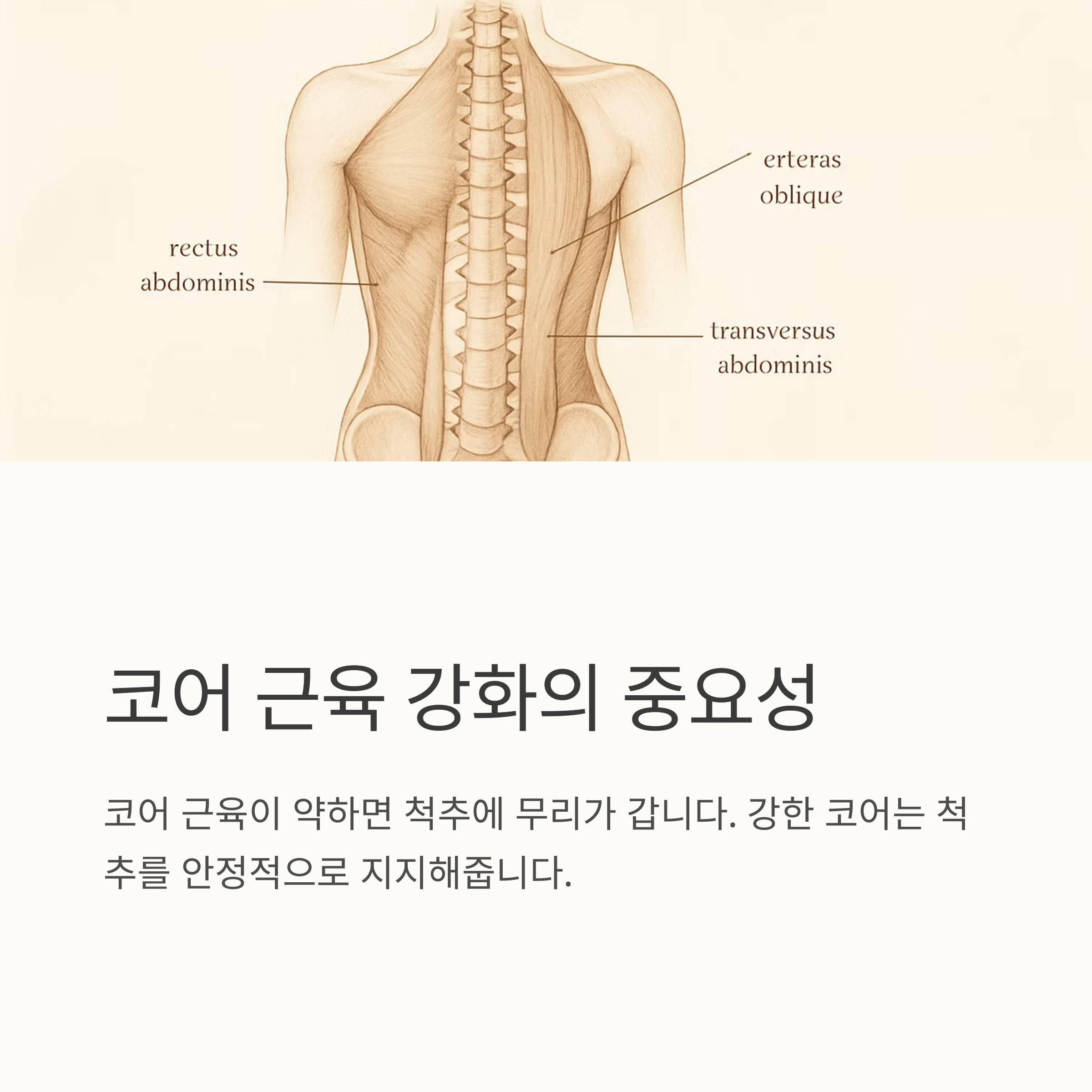 코어 근육이 약하면 척추에 무리가 갈 수 있어요. 플랭크 자세는 코어 근육을 강화하는 데 매우 효과적인 운동입니다. 팔꿈치와 발가락으로 지면을 지지하고, 몸이 일직선이 되도록 유지하는 자세를 30초 정도 유지하는 거예요.