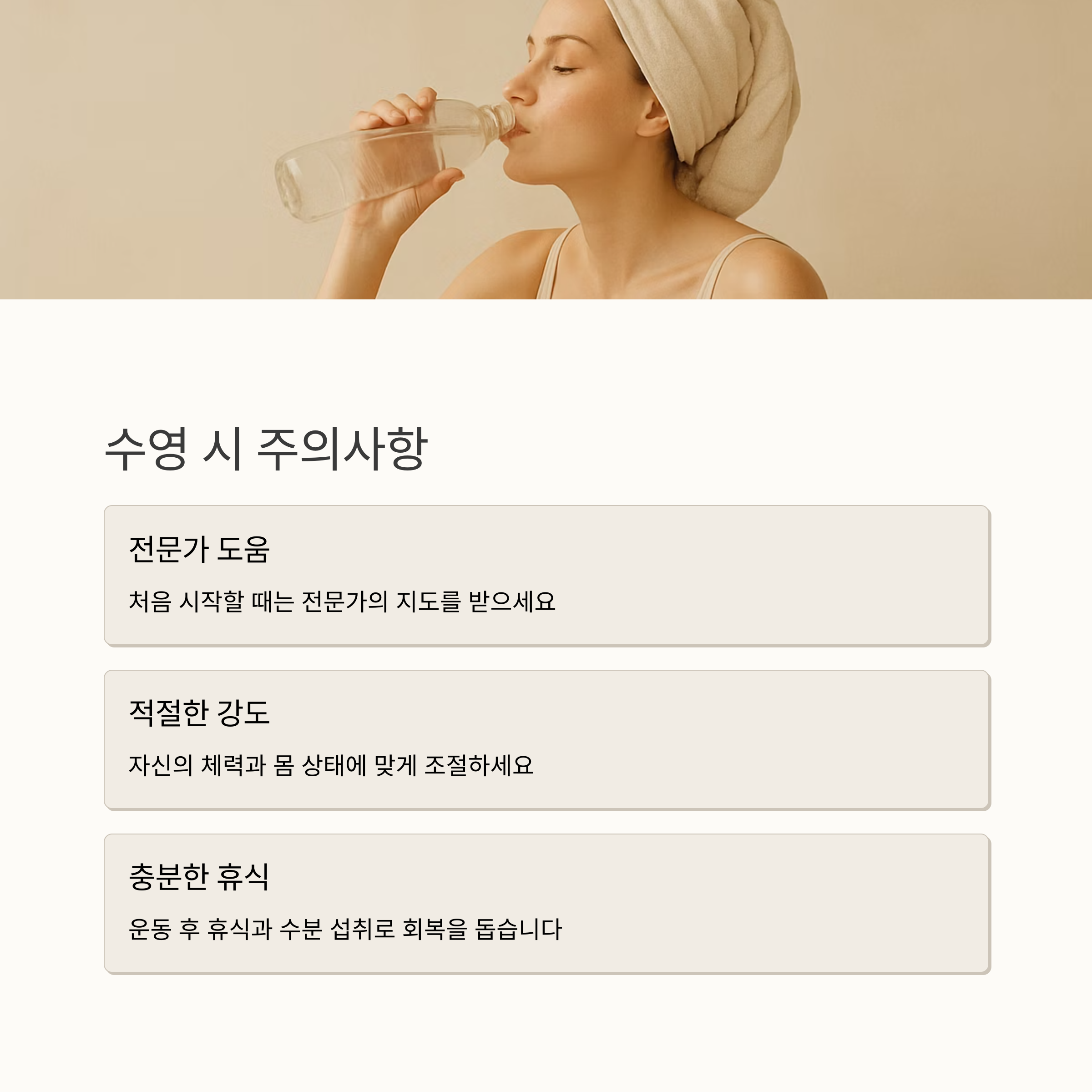 수영 후에는 충분한 휴식을 취하는 것도 잊지 마세요. 수영은 전신운동이므로, 운동 후에는 몸이 피로해지기 쉽습니다. 충분한 휴식과 수분 섭취는 몸의 회복을 돕고 다음 운동을 위한 에너지를 채워줍니다. 수영을 통해 척추의 유연성을 높이고, 전신 건강을 증진시키세요.