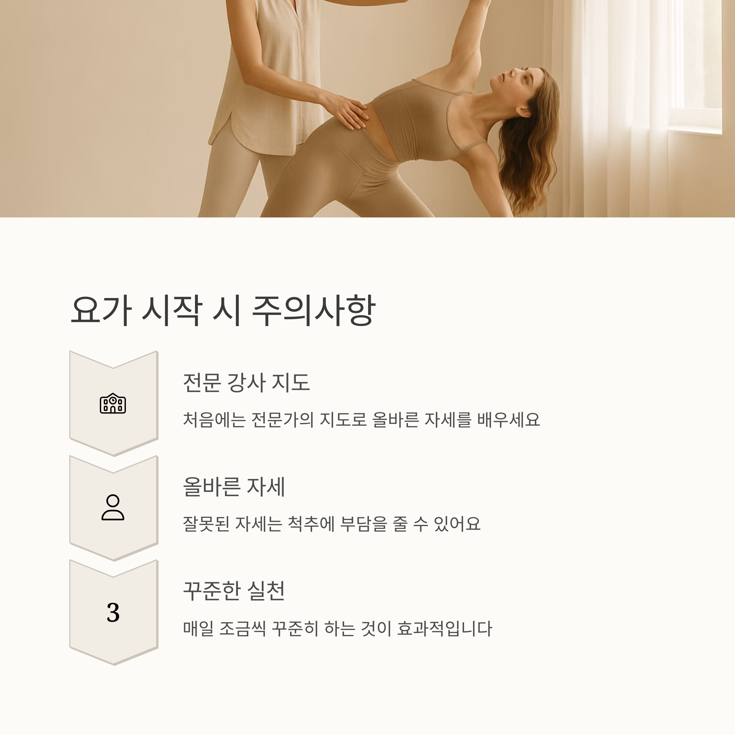 하지만 요가 동작을 처음 접하시는 분들은 전문 강사의 지도를 받는 것이 중요합니다. 잘못된 자세로 요가를 하면 오히려 척추에 부담이 될 수 있으니 주의해야 해요. 요가는 단순한 운동을 넘어서 마음의 안정을 찾는 데에도 도움이 되는 활동입니다.