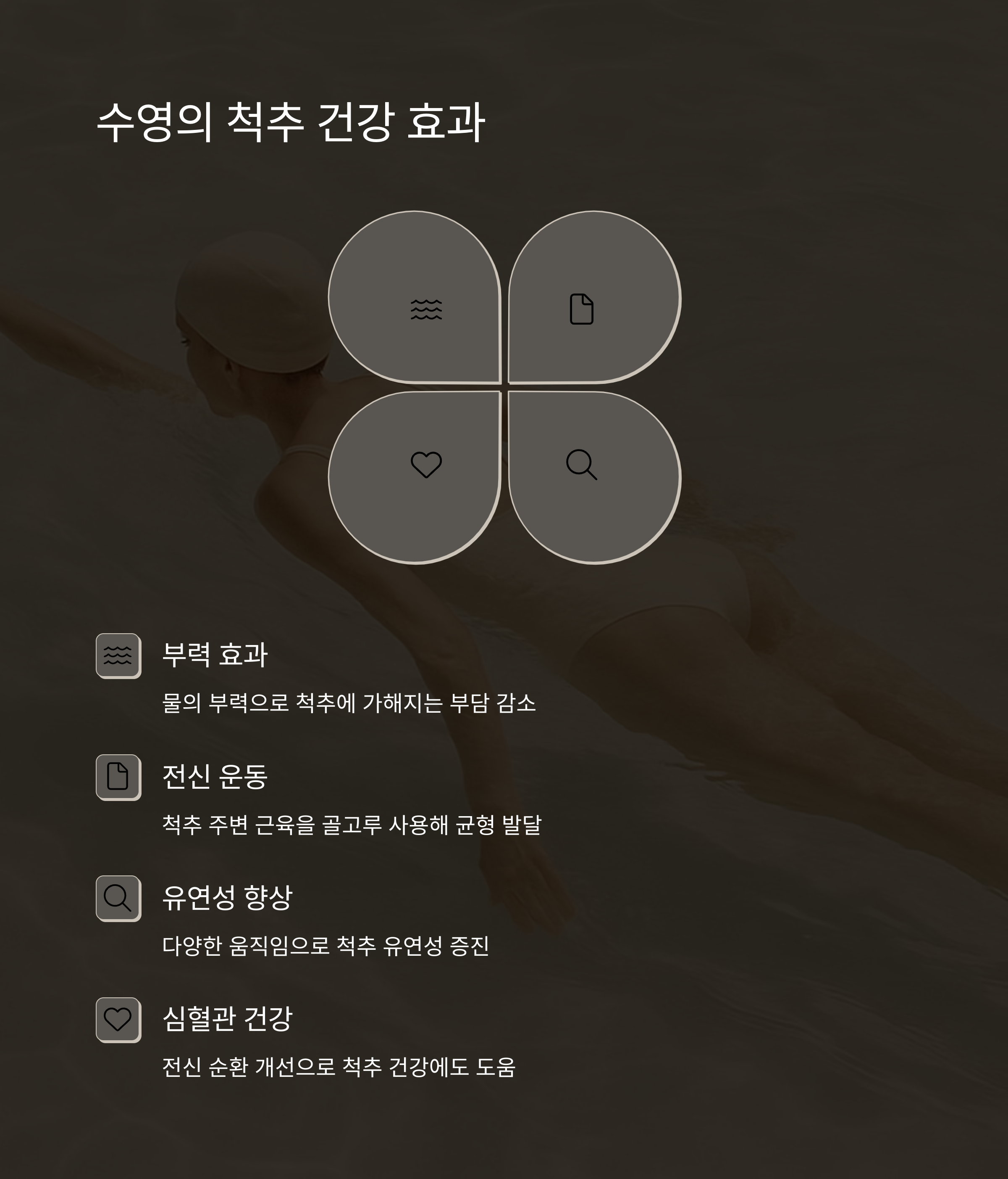 수영은 척추 주변 근육을 골고루 사용하게 만들고 유연성을 향상시켜 척추 건강에 도움이 되는 운동이죠. 하지만, 수영을 처음 시작하는 분들은 전문가의 도움을 받아서 자신의 체력과 몸 상태에 맞는 강도로 운동하는 것이 중요해요.