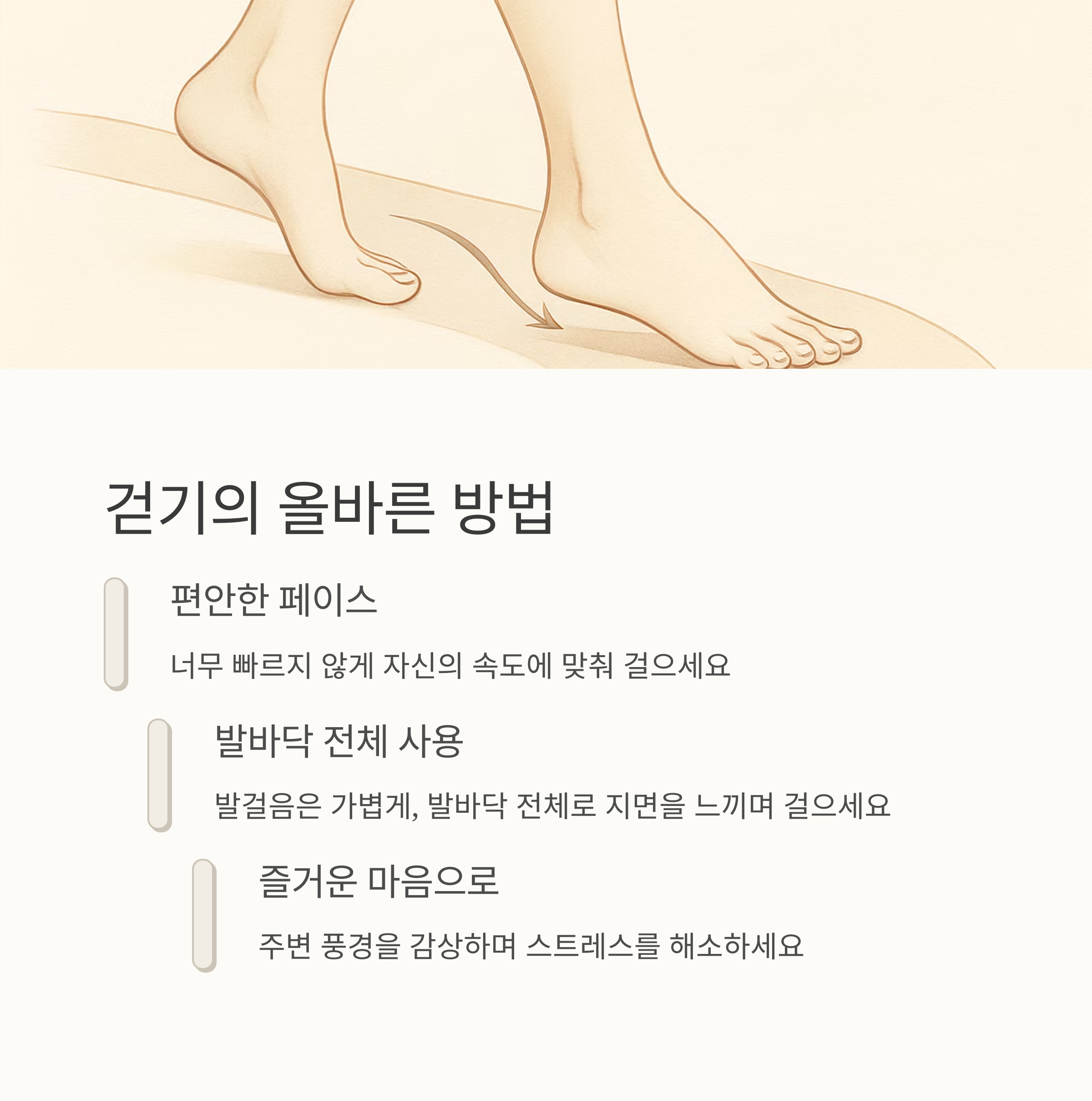 너무 빠르게 걷기보다는 자신의 페이스에 맞춰서 편안하게 걸으세요. 그리고 걷는 자세도 중요하죠. 허리를 곧게 펴고 어깨는 자연스럽게 풀어주세요. 그리고 발걸음은 가볍게, 발바닥 전체를 이용해서 걷는 연습을 해보세요.