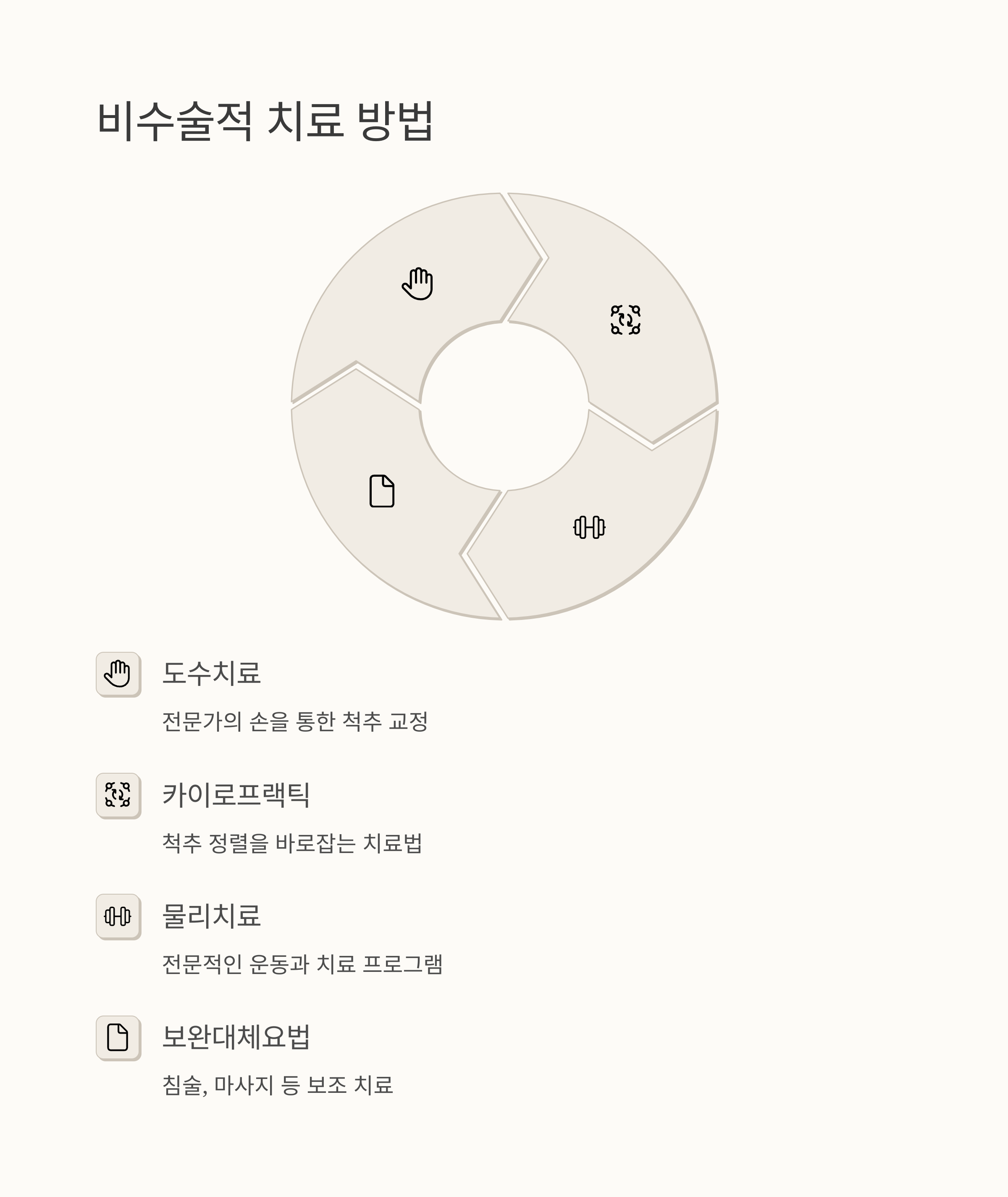 척추측만증 치료는 증상의 심각도에 따라 다릅니다. 초기에는 도수치료나 카이로프랙틱과 같은 비수술적 치료를 통해 통증을 완화하고 자세를 교정할 수 있습니다. 하지만 증상이 심하거나 성장기 청소년의 경우에는 보조기 착용이나 수술이 필요할 수도 있어요.